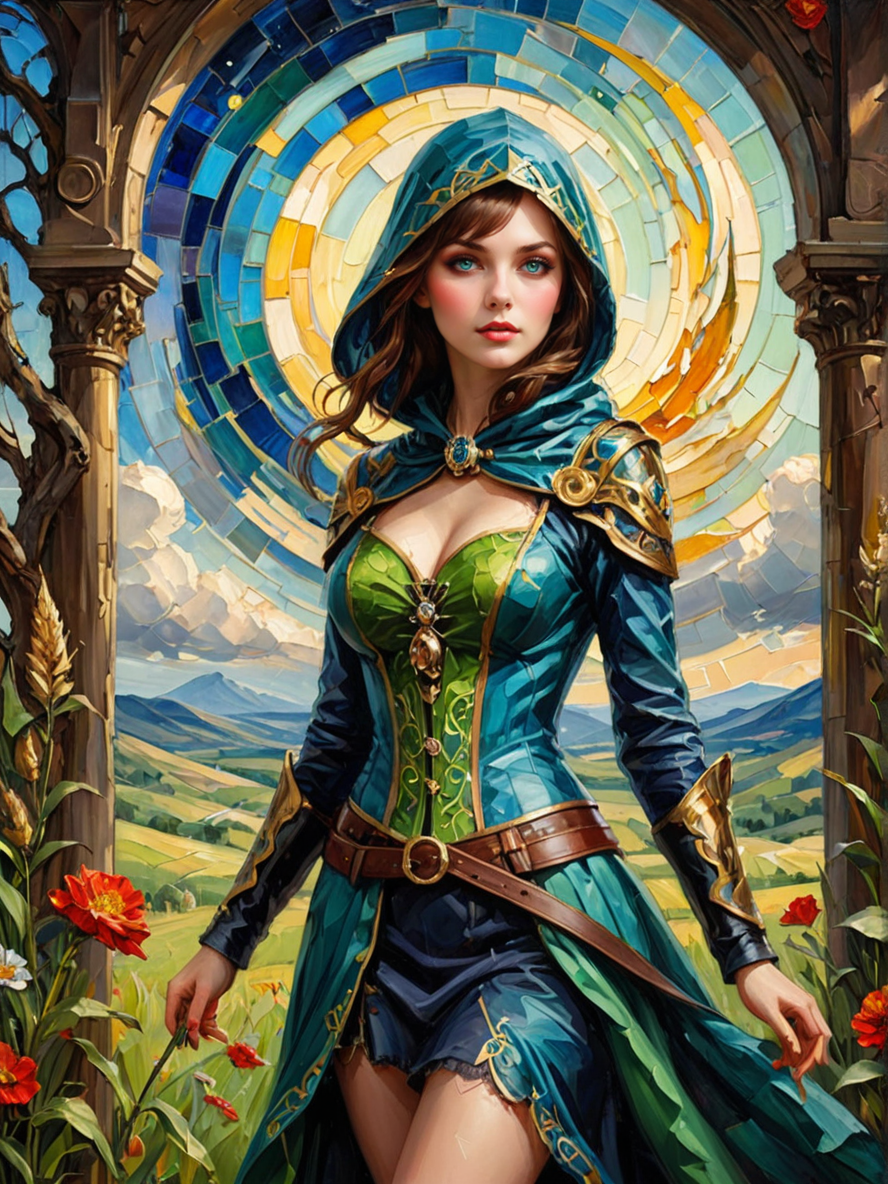 Stained glass style, (Understandable Professional 3D rendering:1.3) of (Ultra detailed:1.3),(Energetic:1.3) Chartreuse, phenomenal,astonishing,functional,dystopian,holistic, unreserved,dangerous,,playful,,menacing,,derisive,medieval,archaic, , brave, , , honest, confident, , patient, optimistic, curious, compassionate, , wise, charismatic, generous, , , diligent, thoughtful, , , , respectful, trustworthy, ambitious, enthusiastic, , , , , disciplined, , , flexible, tactful, , selfless, modest, empathetic, open-minded, , , , , resilient, , , attentive, calm, assertive, focused, adventurous, affectionate, cheerful, considerate, , decisive, dependable, , diplomatic, discreet, easygoing, , , , , friendly, , honorable, , , idealistic, impartial, inspiring, , intuitive, , lively, mature, methodical, , nurturing, , , , polite, protective, , , realistic, resolute, self-reliant, , sociable, , steadfast, , , , intricate, beautiful, polygon, elements, Ebony, Emerald, Ruby, Sapphire, Amber, Gold, Bronze, Diamond, Amethyst, Mosaic, Regular pattern, Topography, Animal, Flower, Object, Branches, glass, crystal, Using the colors red, orange, and yellow create a Realistic and highly detailed painting of a blue eyes goth girl wearing a delicate and feminine mantle and a hood. She is skinny with large breasts, small waist and large buttocks. She is casting a terrifying spell. Behind her is a spell tornado. side view. Grasslands: Wide, open areas dominated by grasses., <lora:EldritchPaletteKnife:0.5> palette knife painting,(by Artist Walter Crane:1.3),CGSociety,ArtStation,(Steampunk Art:1.3),(Green hue:1.3), Vibrant, beautiful, translucent, intricate, detailed
