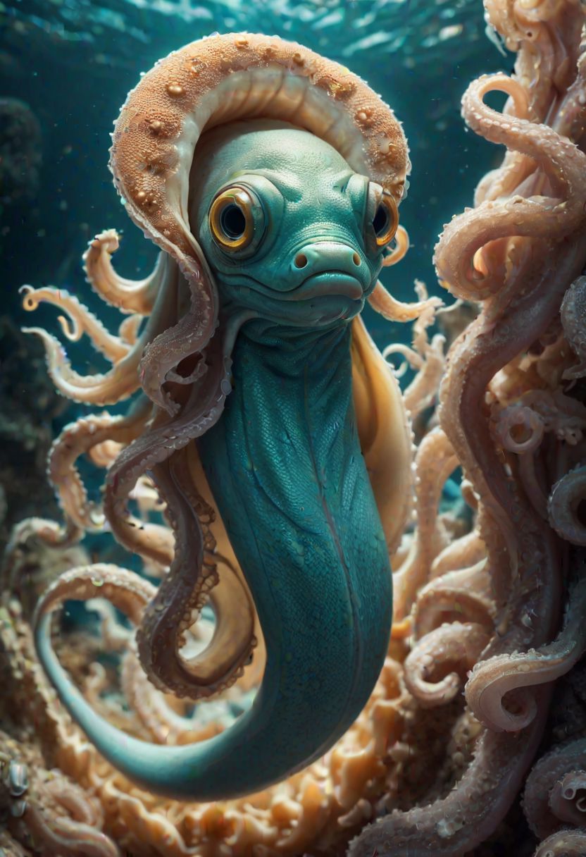 human embryo like moray eel in bottle, (genetic modification of squid with moray eel:1.4), (tentacles body and neck:1.5), huge bee eyes, Centered-Shot, photorealistic, intricate, high detailed, volumetric lighting, cinematic lighting, 8k, octane render, lazy, abstract, ((uniform light background, matte background:1.4)), natural genetic life, abstract animal,