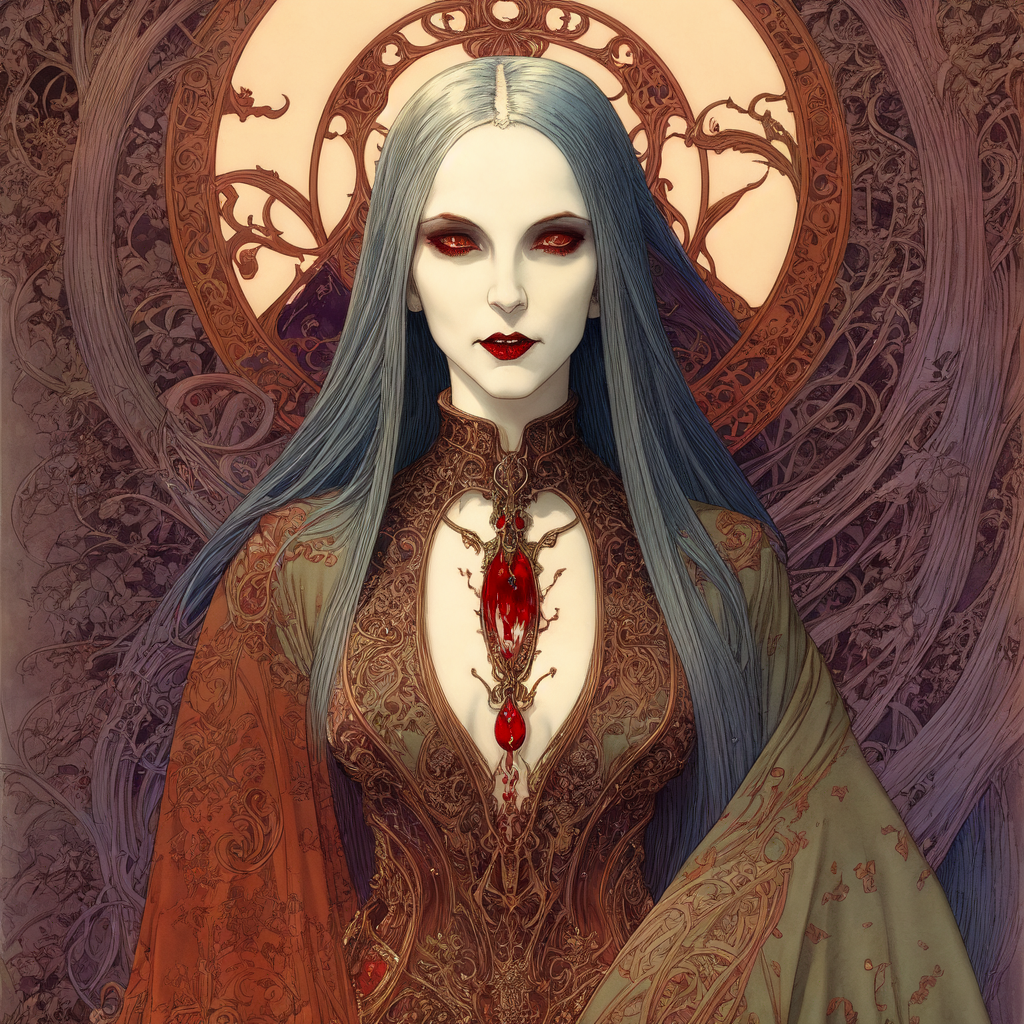painting, portrait, half body Art Nouveau Style, a very pale skinned undead vampire, showing fangs, bloodstains, at the graveyard, dark style, dark sky, weathered, steampunk by moebius, masterpiece, best quality, intricate, highly detailed:1.1, drawing, Jean Giraud, <lora:add_detail:1>, <lora:Moebius:0.7>, <lora:Nouveau_last:1> border, muted colours,