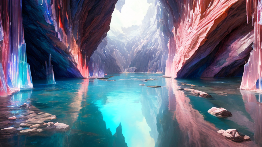 (extremely detailed CG unity 8k wallpaper), wallpaper, highest quality, professional digital art by Ed Blinkey, Atey Ghailan, Studio Ghibli, by Jeremy Mann, Greg Manchess, Antonio Moro, trending on ArtStation, trending on CGSociety, Intricate, High Detail, Sharp focus, dramatic, photorealistic painting art, Majestic crystal cave full of iridescent crystals on the wall, A crystal-clear river winds its way through the middle, cascading over shinning crystals as it flows towards a distant. intricate, detailed, iridescence, meticulous, lavish, fine, elaborate, precise, delicate, accurate, opulent, (photon mapping, physically based rendering, global illumination, area light, indirect lighting, transparency, reflection, caustics, refraction, specular highlights