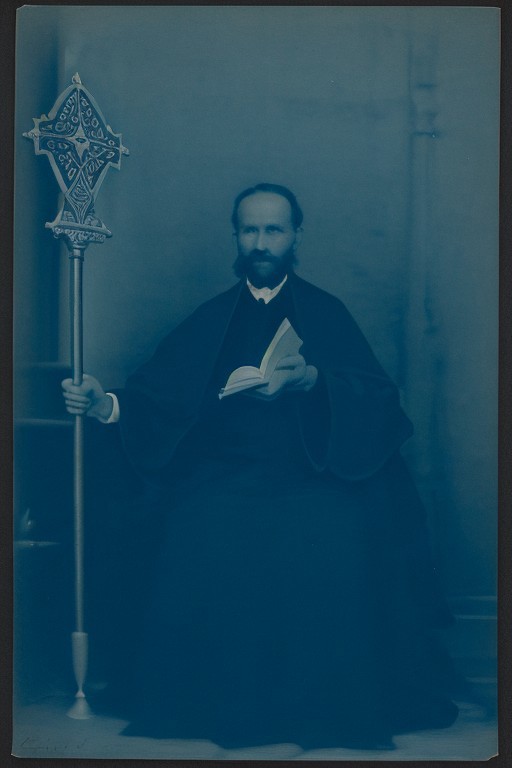 Portrait of a 19th Century mystic-charlatan, seated, wearing a priestly robe with esoteric symbols, holding a sacred tome and a staff of power.