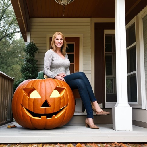 A large pumpkin with a woman's face sitting in the middle of a house's front porch.
