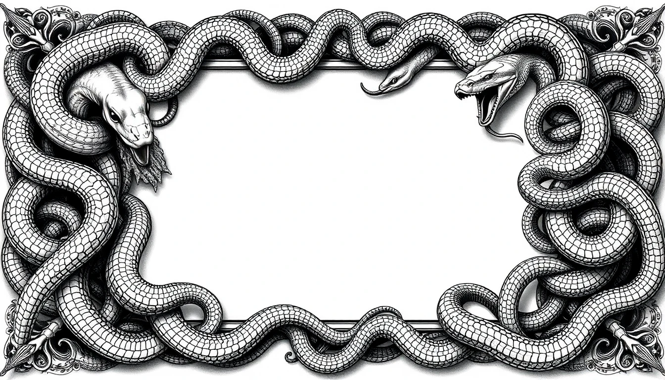 Description of a frame composed entirely of snakes, in black and white style: General composition: Rectangular shape, simulating a picture frame Intertwined snakes forming the four sides of the frame Snake details: Various species of snakes depicted (pythons, king cobras, vipers, etc.) Different scale patterns and detailed textures Variation in snake sizes to create visual interest Some snakes with open mouths, showing fangs Artistic style: High contrast in black and white Engraving or woodcut style for added texture Sharp, detailed lines to highlight scales and shapes Snake composition: Sinuous bodies intertwining in complex ways Snake heads at the corners of the frame, looking out Some tails visible at the ends Visual effects: Play of light and shadow to create depth Use of pointillism or hatching to add texture and volume Interior space: Empty center of the frame, as if to frame a picture Light shading in the inner corners to add depth Overall style: Intricate and detailed appearance, inviting close observation Balance between realistic and stylized elements Concept: An ornate and slightly macabre frame, ideal for framing Gothic or Surrealist art.