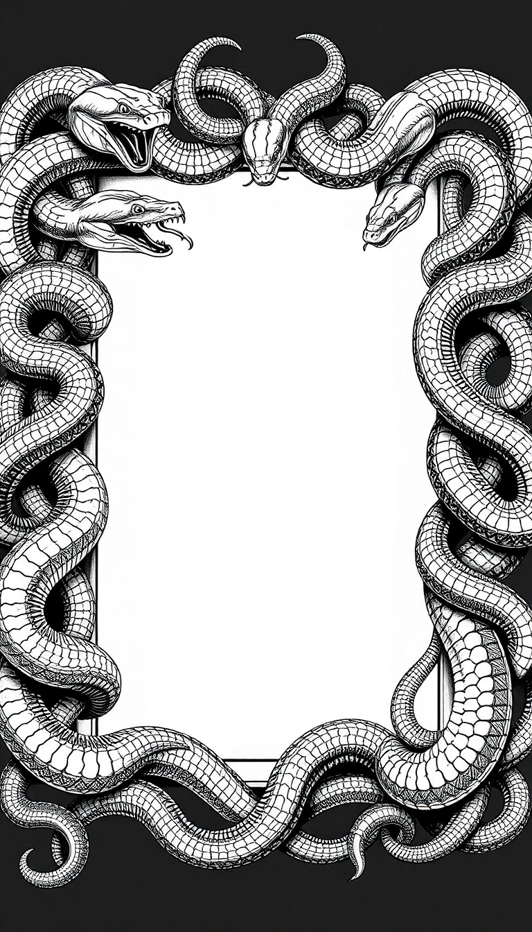 Description of a frame composed entirely of snakes, in black and white style: General composition: Rectangular shape, simulating a picture frame Intertwined snakes forming the four sides of the frame Snake details: Various species of snakes depicted (pythons, king cobras, vipers, etc.) Different scale patterns and detailed textures Variation in snake sizes to create visual interest Some snakes with open mouths, showing fangs Artistic style: High contrast in black and white Engraving or woodcut style for added texture Sharp, detailed lines to highlight scales and shapes Snake composition: Sinuous bodies intertwining in complex ways Snake heads at the corners of the frame, looking out Some tails visible at the ends Visual effects: Play of light and shadow to create depth Use of pointillism or hatching to add texture and volume Interior space: Empty center of the frame, as if to frame a picture Light shading in the inner corners to add depth Overall style: Intricate and detailed appearance, inviting close observation Balance between realistic and stylized elements Concept: An ornate and slightly macabre frame, ideal for framing Gothic or Surrealist art.