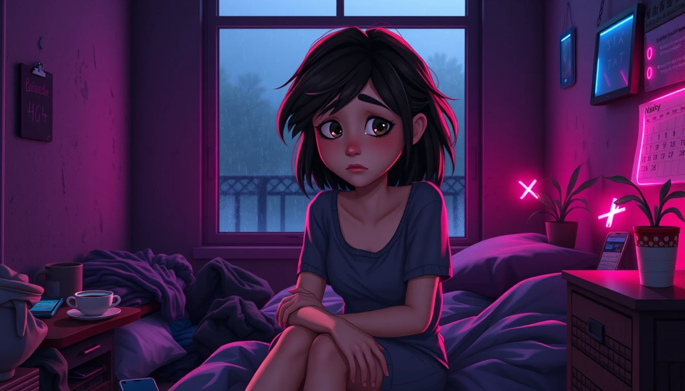 Description of an image depicting a female Pixar character with symptoms of depression: Main character: Young woman in the Pixar animation style Hair is disheveled and messy, partially covering her face Large, expressive eyes with visible dark circles under them Sad, dejected facial expression Hunched posture, shoulders slumped Clothes are wrinkled and slightly loose Setting: Small, cluttered room Peeling walls with damp stains Piles of clothes and objects strewn across the floor Foggy window showing a dark, rainy sky Lighting and effects: Cool, dim key lighting Contrasting neon effects: Pink neon light coming from a store sign outside the window Blue neon reflections from a TV on out of frame Long, dramatic shadows Additional details: Half-empty cup of coffee on a side table Smartphone with unread notifications glowing in neon Calendar on the wall with several days marked in X's Wilting plants in a pot on the windowsill Composition: Character sitting on the edge of an unmade bed A slightly elevated angle to show the room and the character Focus on the character's face, capturing their emotional expression Style and atmosphere: Mixture of Pixar's cheerful, rounded style with a melancholic atmosphere Predominantly cool, desaturated colors, except for the neon accents Detailed textures to emphasize the unkempt environment Overall concept: An image that contrasts Pixar's typically cheerful style with a sensitive depiction of depression, using neon effects to create an urban, lonely atmosphere.Last edited just now