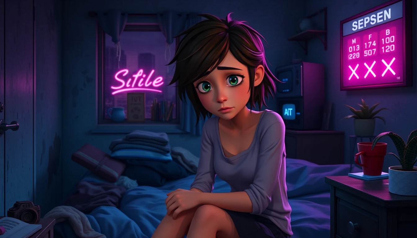 Description of an image depicting a female Pixar character with symptoms of depression: Main character: Young woman in the Pixar animation style Hair is disheveled and messy, partially covering her face Large, expressive eyes with visible dark circles under them Sad, dejected facial expression Hunched posture, shoulders slumped Clothes are wrinkled and slightly loose Setting: Small, cluttered room Peeling walls with damp stains Piles of clothes and objects strewn across the floor Foggy window showing a dark, rainy sky Lighting and effects: Cool, dim key lighting Contrasting neon effects: Pink neon light coming from a store sign outside the window Blue neon reflections from a TV on out of frame Long, dramatic shadows Additional details: Half-empty cup of coffee on a side table Smartphone with unread notifications glowing in neon Calendar on the wall with several days marked in X's Wilting plants in a pot on the windowsill Composition: Character sitting on the edge of an unmade bed A slightly elevated angle to show the room and the character Focus on the character's face, capturing their emotional expression Style and atmosphere: Mixture of Pixar's cheerful, rounded style with a melancholic atmosphere Predominantly cool, desaturated colors, except for the neon accents Detailed textures to emphasize the unkempt environment Overall concept: An image that contrasts Pixar's typically cheerful style with a sensitive depiction of depression, using neon effects to create an urban, lonely atmosphere.Last edited just now