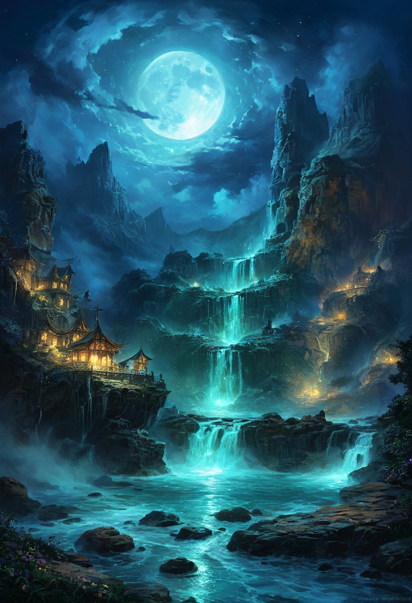 (by Ellen Jewett:1.5), (Bioluminescent Impressionism, , The Dreamland, Under the eerie glow of a blue crescent moon, a bright and wonderous landscape unfolds . A vibrant, and glowing brown lumenarium flying ship flies over a wonderful landscape of great, yet lush canyones with waterfalls. Its black paint contrasts starkly with the wonderous atmosphere. In the background, more waterfalls cascades down jagged rocks,the water glistening in the moonlight. urithiru, tower city, up on a mountain, Thick,s wirling clouds loom overhead,adding to the sense of a magical presence. The moonlight filters through the clouds,casting an otherworldly glow over the scene. The air is thick with mysticism,as if the very night holds ancient secrets and powerful magic. [romantic impressionism,dream scenery art,beautiful oil matte painting,romantic,style of thomas kinkade,beautiful digital painting,anime landscape,romantic painting,dreamlike digital painting,colorful painting,beautiful gorgeous digital art,style of greg rutkowski,janek sedlar,jenny saville:0] <lora:vivid_everclear:0.35> <lora:Sinozick:0.35> <lora:MJ52:0.35>, view from above, biotech emotion:1.3) <lora:xl_more_art-full_v1:0.5> <lora:add-detail-xl:1> <lora:RMSDXL_Creative:2>