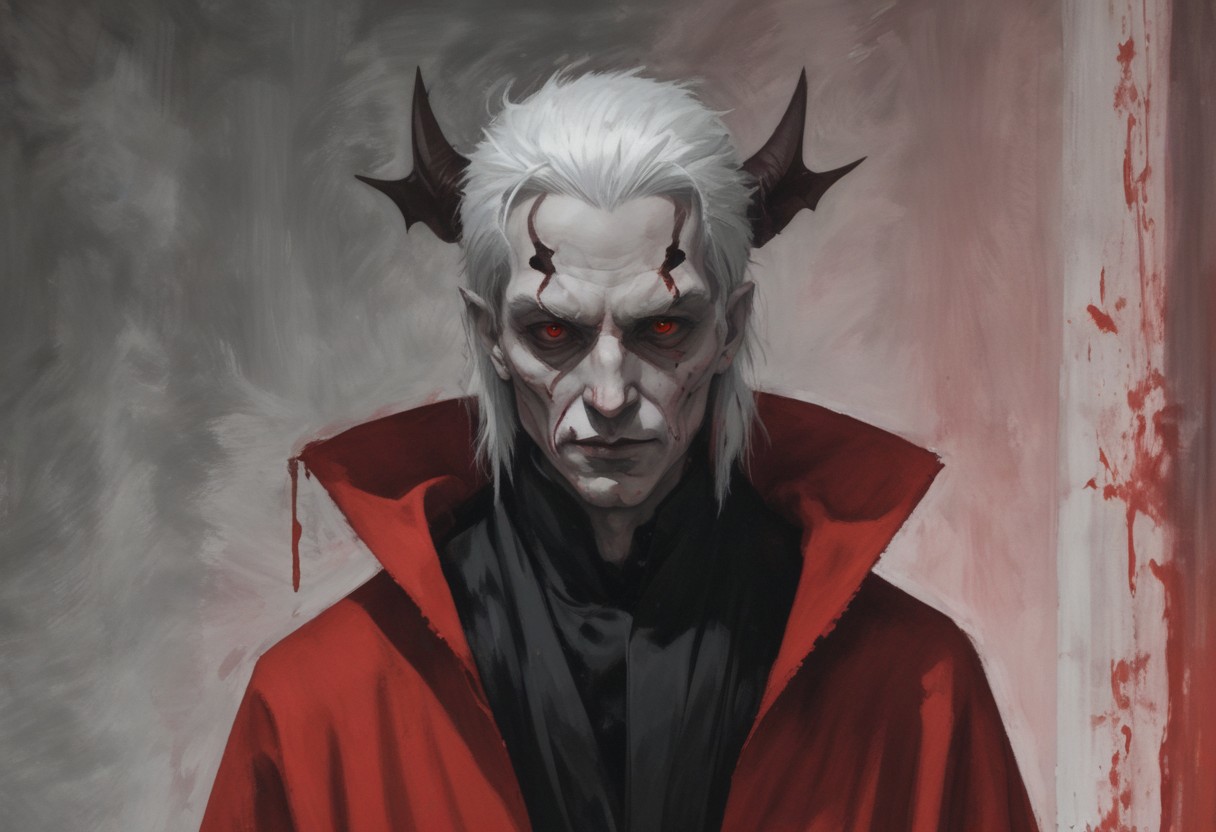 VtmArt, painting of a Andrei Tzimisce from Vampire The Masquarade: Bloodlines, red ancient robe, deformed vampire bat like head, ancient vampire, Tzimisce, lora:VtmArt:1.5>, at night, bleach colors,