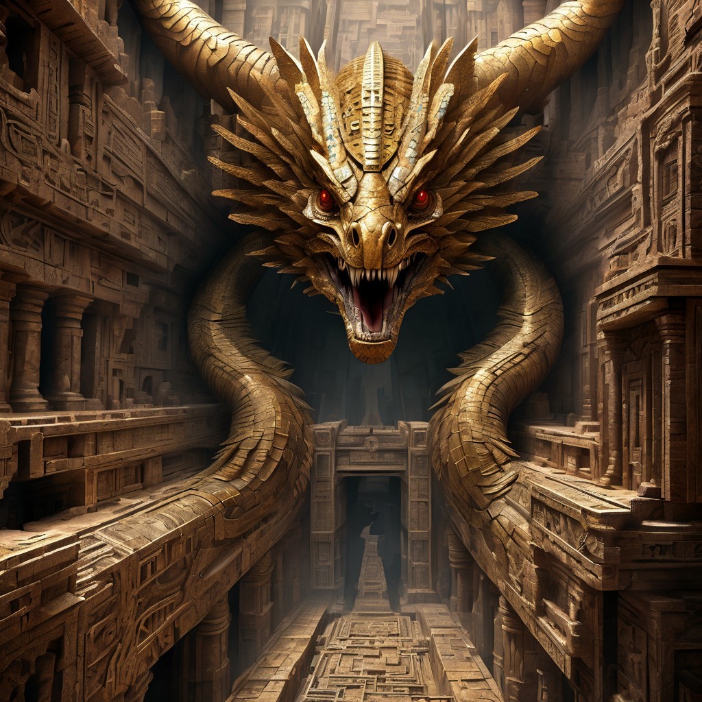 Masterpiece, best quality, {best quality}, {{masterpiece}}, {higher}, dark world, underground labyrinth city, cross-section, people's lives, advanced civilization, computer controlled, fantasy art, delicate and dynamic textures, 2.5D, artistic photography, hyper realistic, digital graphic CG, BREAK ultra detailed, absolutely resolution, best quality, exotic, Quetzalcoatl, Kukulkan, Serpent God, dragon, serpent, flying feathers, plumage, Aztec, gold, gold, thunder, thunder