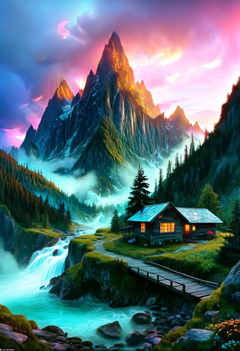 (by Ellen Jewett:1.5), (Bioluminescent Impressionism, alien mountain landscape , their peaks veiled in mist. mixed media, surrealism, great lighting, A surreal landscape highly detailed . extremely high-resolution details, appears trapped in an optical illusion of reflections and refractions colorful , mountain cabin built into a cliff with a brilliant porch looking out over mountains , professional photography, natural lighting, volumetric lighting maximalist. intricately detailed, complex, elegant, expansive, fantastical, film photography style, medium graincinematic experience.,, illustration, cinematic <lora:DonM3t3rn1tyXL-v1.1:0.7>, DonM3t3rn1tyXL, OverallDetailXL <lora:MJ52:0.3> <lora:SDXLFaeTastic2400:0.4> <lora:EpicF4nta5yXL:0.7>. great beams of light shooting up into the sky, sky sunset, sunrise ,waterfall, ethereal landscapes, depth of field, biotech emotion:1.3) <lora:xl_more_art-full_v1:0.5> <lora:add-detail-xl:1> <lora:RMSDXL_Creative:2>