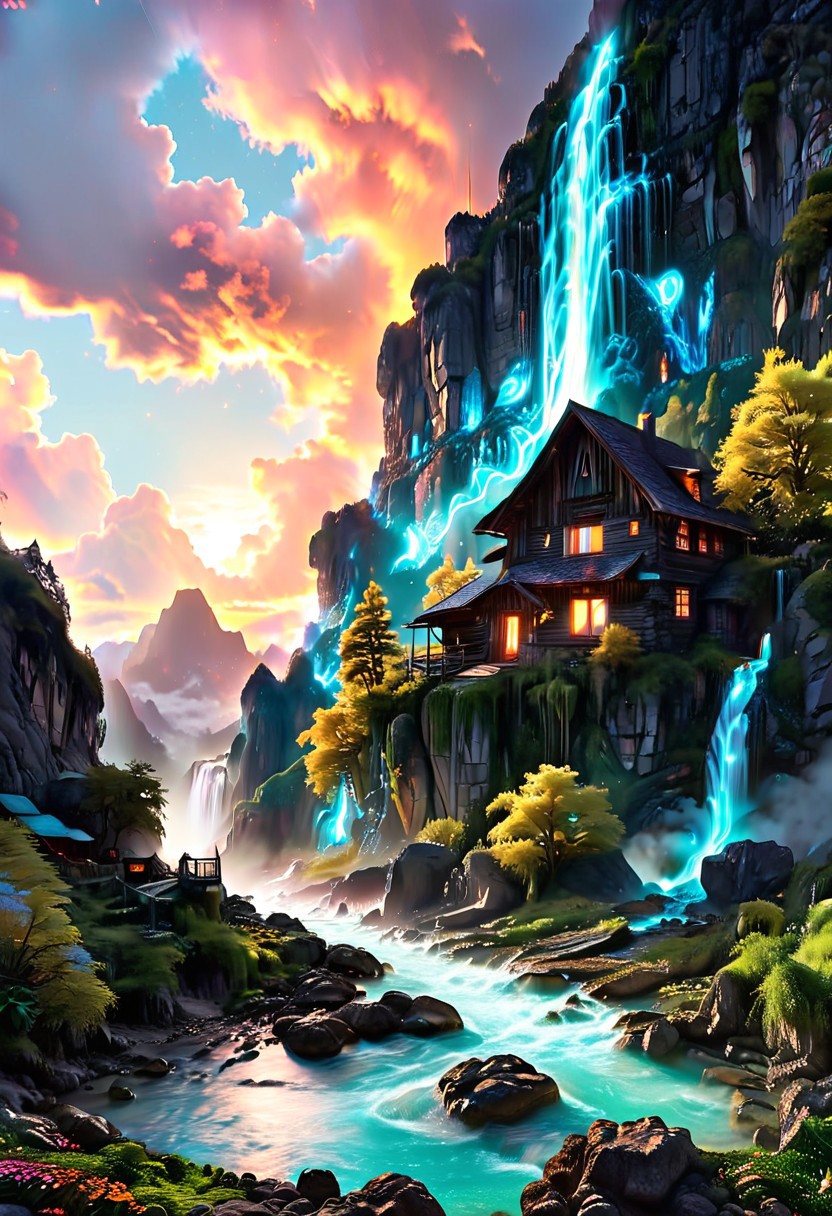 (by Ellen Jewett:1.5), (Bioluminescent Impressionism, alien mountain landscape , their peaks veiled in mist. mixed media, surrealism, great lighting, A surreal landscape highly detailed . extremely high-resolution details, appears trapped in an optical illusion of reflections and refractions colorful , mountain cabin built into a cliff with a brilliant porch looking out over mountains , professional photography, natural lighting, volumetric lighting maximalist. intricately detailed, complex, elegant, expansive, fantastical, film photography style, medium graincinematic experience.,, illustration, cinematic <lora:DonM3t3rn1tyXL-v1.1:0.7>, DonM3t3rn1tyXL, OverallDetailXL <lora:MJ52:0.3> <lora:SDXLFaeTastic2400:0.4> <lora:EpicF4nta5yXL:0.7>. great beams of light shooting up into the sky, sky sunset, sunrise ,waterfall, ethereal landscapes, depth of field, biotech emotion:1.3) <lora:xl_more_art-full_v1:0.5> <lora:add-detail-xl:1> <lora:RMSDXL_Creative:2>