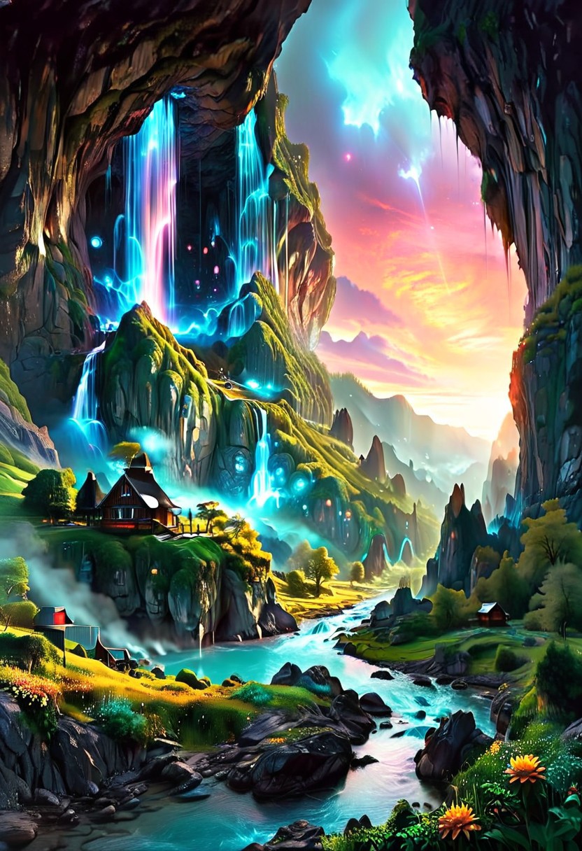 (by Ellen Jewett:1.5), (Bioluminescent Impressionism, alien mountain landscape , their peaks veiled in mist. mixed media, surrealism, great lighting, A surreal landscape highly detailed . extremely high-resolution details, appears trapped in an optical illusion of reflections and refractions colorful , mountain cabin built into a cliff with a brilliant porch looking out over mountains , professional photography, natural lighting, volumetric lighting maximalist. intricately detailed, complex, elegant, expansive, fantastical, film photography style, medium graincinematic experience.,, illustration, cinematic <lora:DonM3t3rn1tyXL-v1.1:0.7>, DonM3t3rn1tyXL, OverallDetailXL <lora:MJ52:0.3> <lora:SDXLFaeTastic2400:0.4> <lora:EpicF4nta5yXL:0.7>. great beams of light shooting up into the sky, sky sunset, sunrise ,waterfall, ethereal landscapes, depth of field, biotech emotion:1.3) <lora:xl_more_art-full_v1:0.5> <lora:add-detail-xl:1> <lora:RMSDXL_Creative:2>