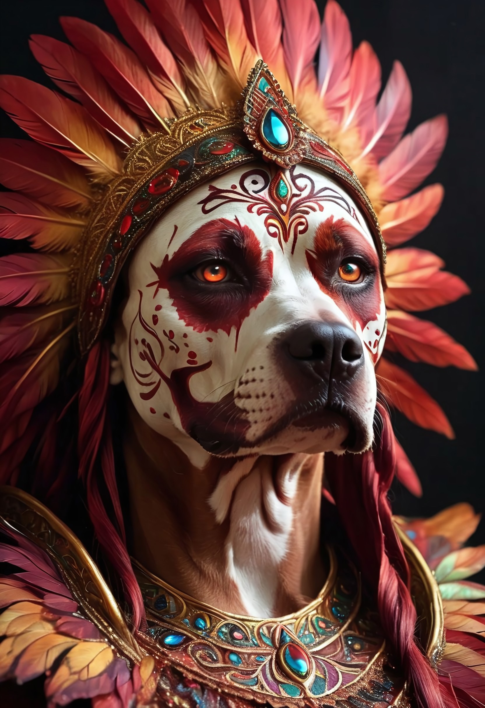 One Majestic red brown pitbull dog in full vibrant Calavera facepaint, calvera facepaint, day of the dead, sugar skull, elaborate feathered headdress, perfect eyes, gold eyes, epic, legendary, happy look, warm open fire in the background, intricate, detailed, classical fantasy, ethereal, magical, dreamlike, surreal, visionary, mythical, mystical, otherworldly, iridescent, luminous, glowing, shimmering, radiant, prismatic, kaleidoscopic, (best quality,4k,8k,highres,masterpiece:1.2),ultra-detailed,(realistic,photorealistic,photo-realistic:1.37),dramatic lighting, chiaroscuro, cinematic, moody, atmospheric, painterly, rich colors, vibrant palette, lush, sumptuous