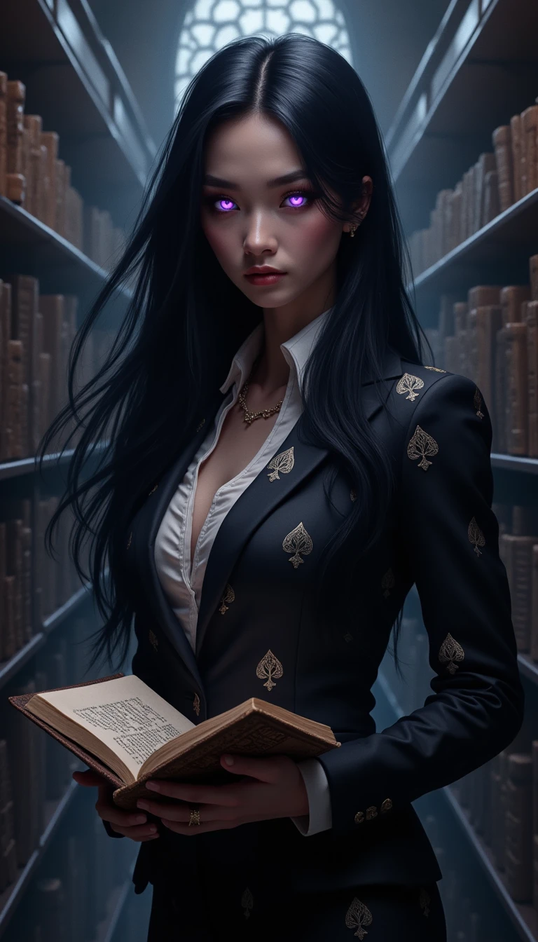 4K photorealistic style quality, digital drawing mode, a dark and calculating woman with long raven-black hair and glowing violet eyes, wearing a dark suit adorned with spade patterns, standing in a shadowy library filled with ancient tomes, radiant skin with a soft moonlit glow, calm and intellectual expression, full body, dynamic pose as she holds a book of strategies, life size, perfect anatomy, detailed skin texture, full HD, 4K, HDR, perfect anatomy, depth of field."