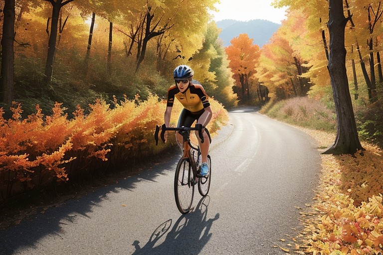 A cyclist rides along the path of the golden autumn forest in the rays of the amber sunset