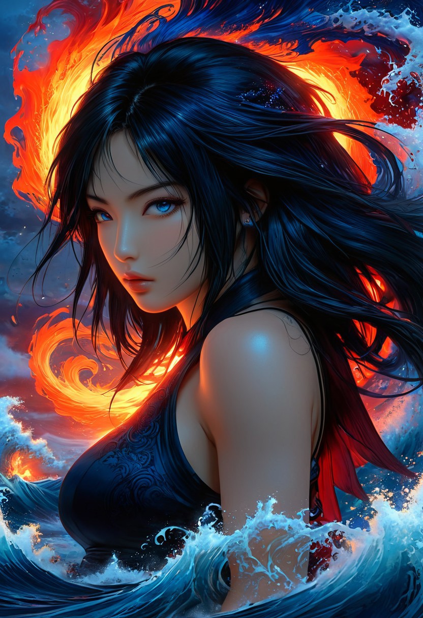This mesmerizing Japanese-style illustration features Tifa Lockhart, with her black hair flowing elegantly in the presence of towering indigo waves. Her eyes, glowing crimson, convey a sense of intensity and determination. The captivating combination of colors, unique styling, and powerful imagery creates a vivid and evocative scene that is both visually striking and emotionally resonant.