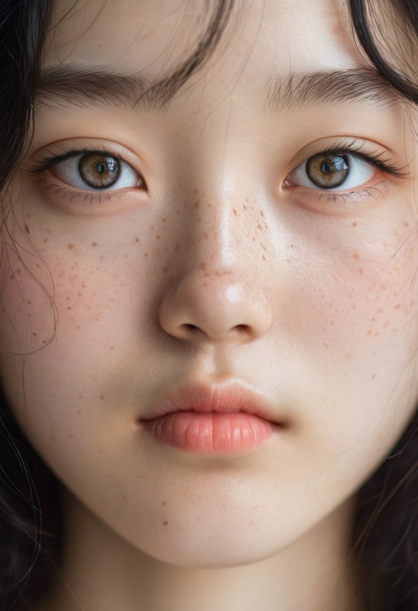 Hyperdetailed, close-up portrait of a Japanese model, 19 years old, with pale skin, freckles, and wavy black hair, looking directly at the viewer with a cute and pretty expression, highlighting her realistic skin and facial features, with a focus on her detailed eyes and lips