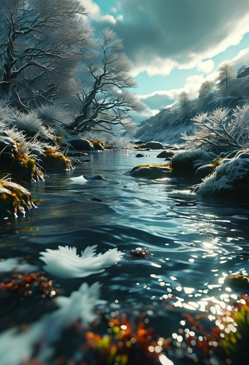 (ultra high res:1.4), (masterpiece), (beautiful lighting:1.4) ,Scottish greenery, Scottish river, icy water water, forest, Scottish Highlands, sunlight illuminates the icy water, (deep underwater), anime, half above water and half below water , (clear underwater), beautiful sky with clouds, depth, GhostlyStyle