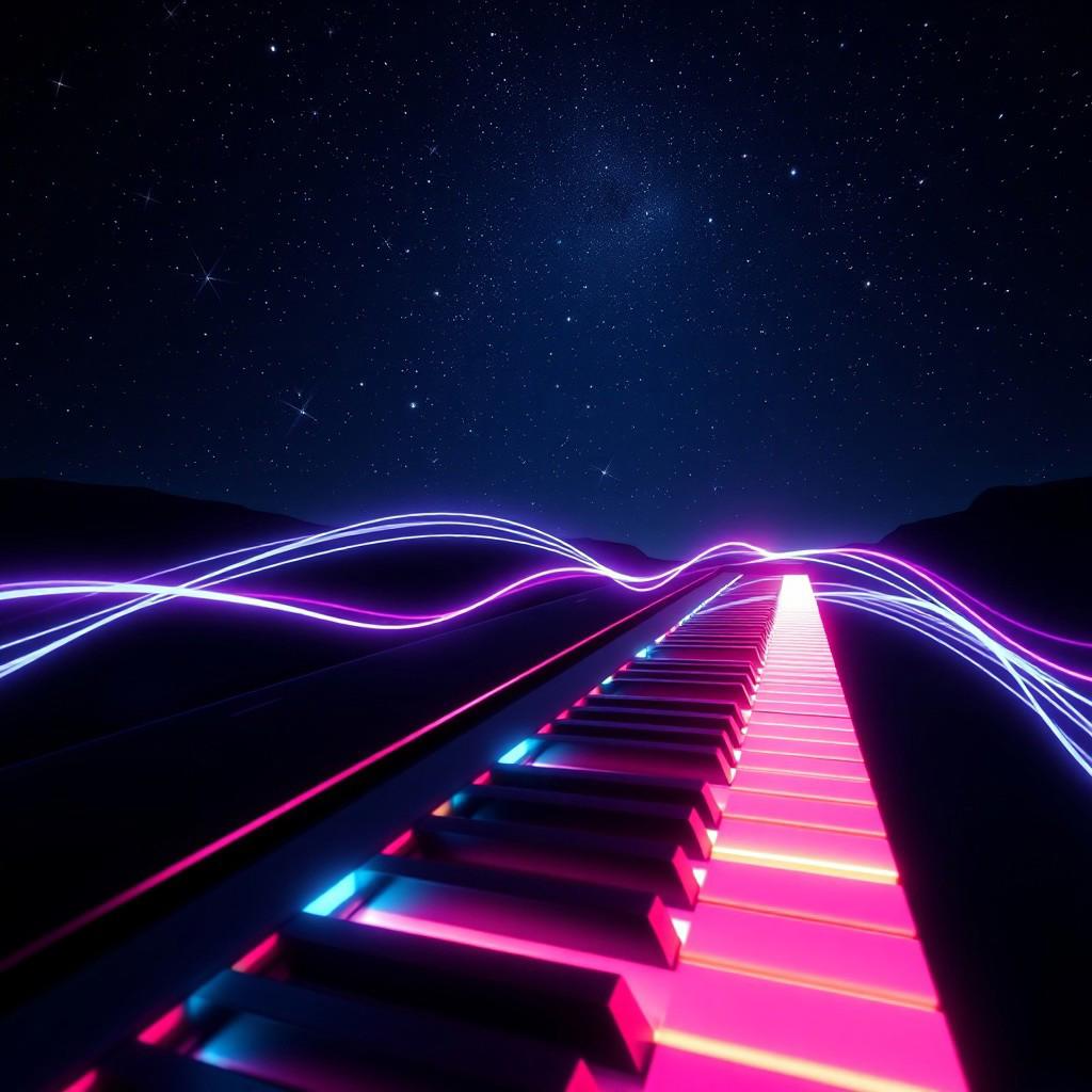 A dark starry night sky, A piano with glowing keys, Light trails or waves coming from the piano, giving an electronic vibe, Dark blues and purples for the sky, bright whites and neon for the keys and light trails, Cover art