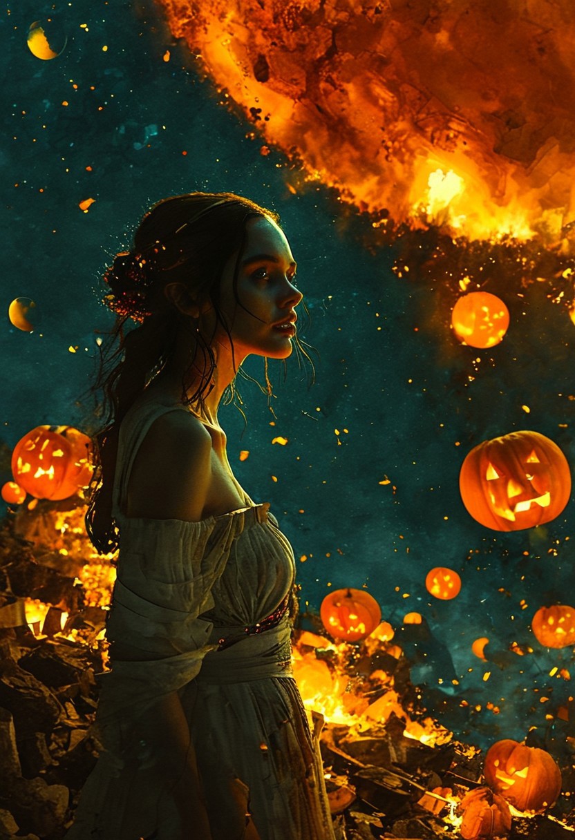 1girl, a beautiful sorceress summons flying fiery jack o lanterns, Cinematic composition perspective, Fractured, impressionistic bidimensional goddess watercolor (klimt:1.4) dadaistic collage (by Bill Sienkiewicz:1.5), overlooking a spaceport in flames on an alien planet, the broken moon can be seen low in the sky. Resplendent spotlighting. Masterpiece, very high level of detail.