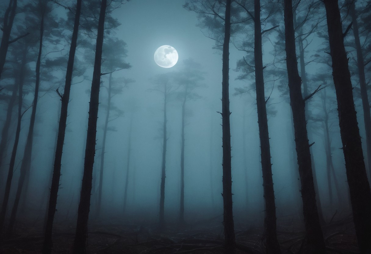 there's a forest with a creepy vibe, the full moon had risen in the night sky, pretty foggy around the trees that are crooked and bendy, with ground that is shaking to the core, with roots that peeks out