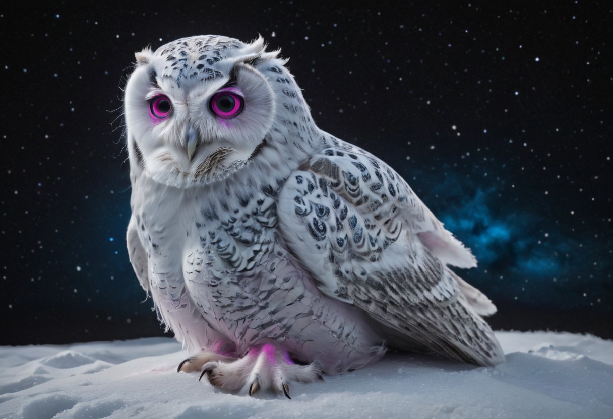 A mystical snowy owl perched in a shadowy void, cradling a swirling galaxy within its chest that radiates with vibrant pink, purple, and blue hues, casting a cosmic glow over its intricately detailed feathers. The owl’s intense, crystalline blue eyes gleam in the darkness, creating a striking contrast against its dark form. The glow from the galaxy gradually transitions into soft shadows across the owl's body, enhancing the mystic atmosphere. Tiny, luminous cannabis particles float around, creating a magical, otherworldly ambiance as faint wisps of cosmic fog drift through the scene, adding depth and volume to the surrounding darkness. The delicate gradient lighting highlights each feather, and the HDR effect brings out ultra-realistic textures and colors, adding depth to the owl's features. Settings: light diffusion at 0.4 for smooth glow transitions, glow intensity at 0.75 for a balanced radiance, contrast at 1.3 for enhanced color vibrancy, particle density at 0.6 for rich stardust effect, fog density at 0.3 for subtle atmosphere, vignette at 0.45 for gentle framing, shadow gradient at 0.5 to soften edges, edge glow intensity 0.8 for subtle highlights around the owl, ambient occlusion at 0.5 for realistic shadowing, HDR maxed for vivid detail, soft background blur for depth, and overall weight 1.1 and 0.9 for balanced emphasis on glow and shadows.