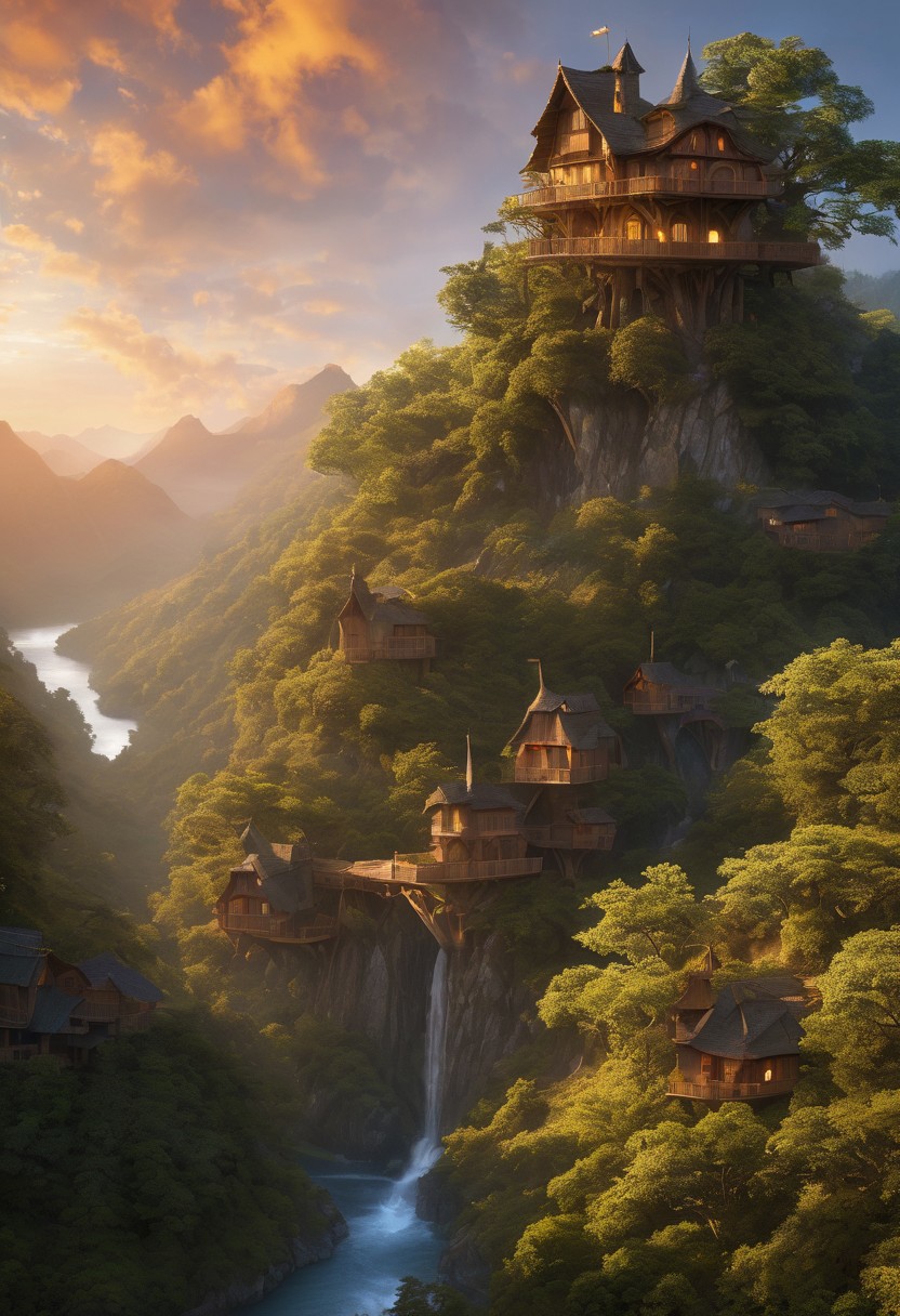 valley, fairytale treehouse village covered, , matte painting, highly detailed, dynamic lighting, cinematic, realism, realistic, photo real, sunset, detailed, high contrast, denoised, centered, michael whelan