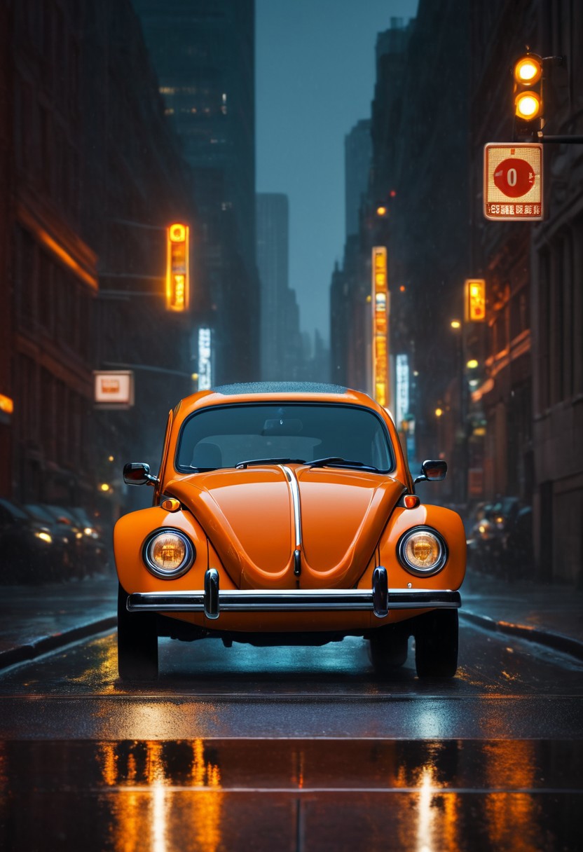 A stunning and realistic CGI rendering of a Volkswagen Beetle cruising along a bustling nighttime city street. The car's vibrant orange hue stands out against the dark surroundings, with its headlights illuminating the scene and casting a warm glow on the wet pavement. In the corner of the image, a traffic light changes colors, and a fire hydrant sits by the curb. The 16:9 aspect ratio captures the dynamic cityscape, with towering buildings and neon lights reflecting on the wet streets. The attention to detail and atmospheric elements create a sense of depth and dimension, immersing the viewer in the urban night scene.