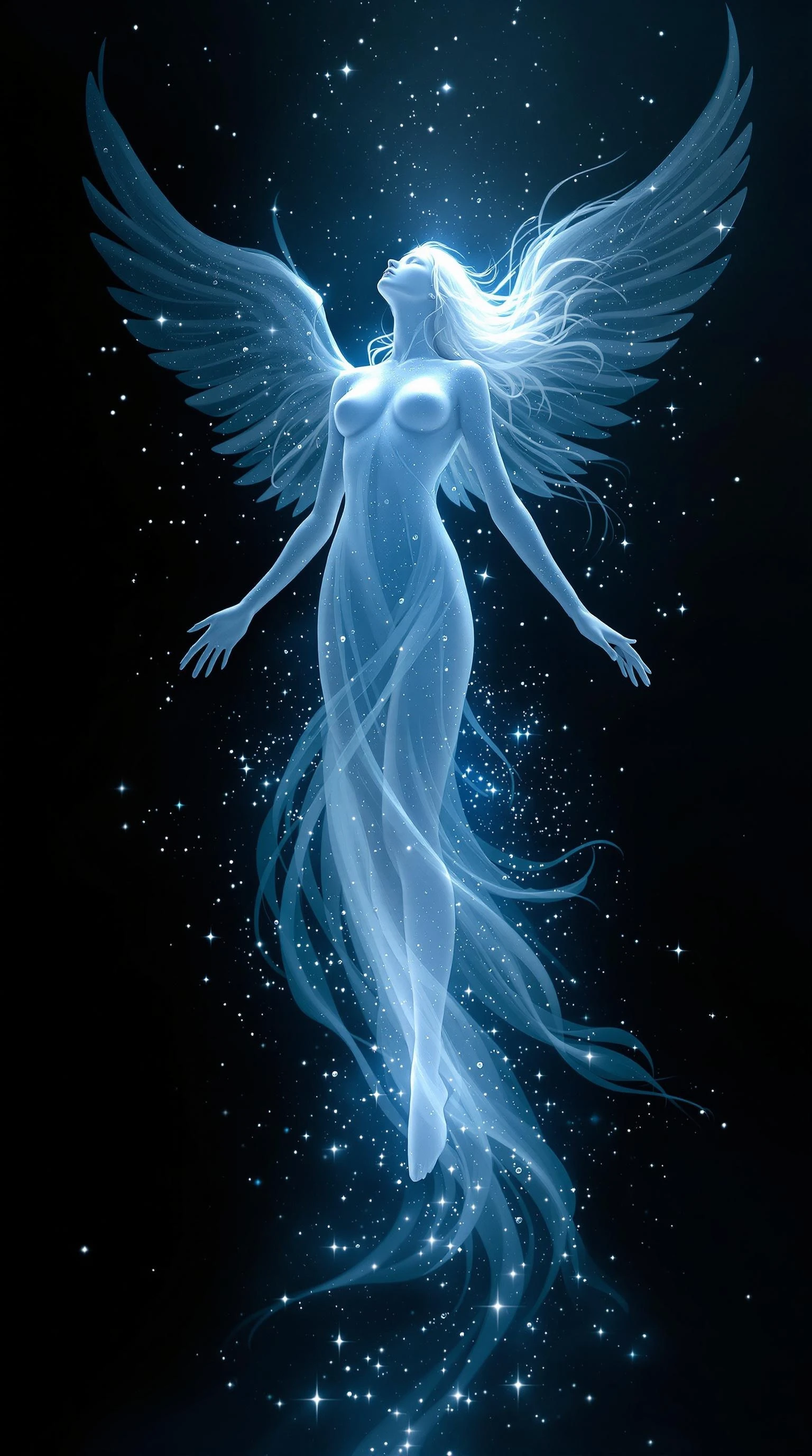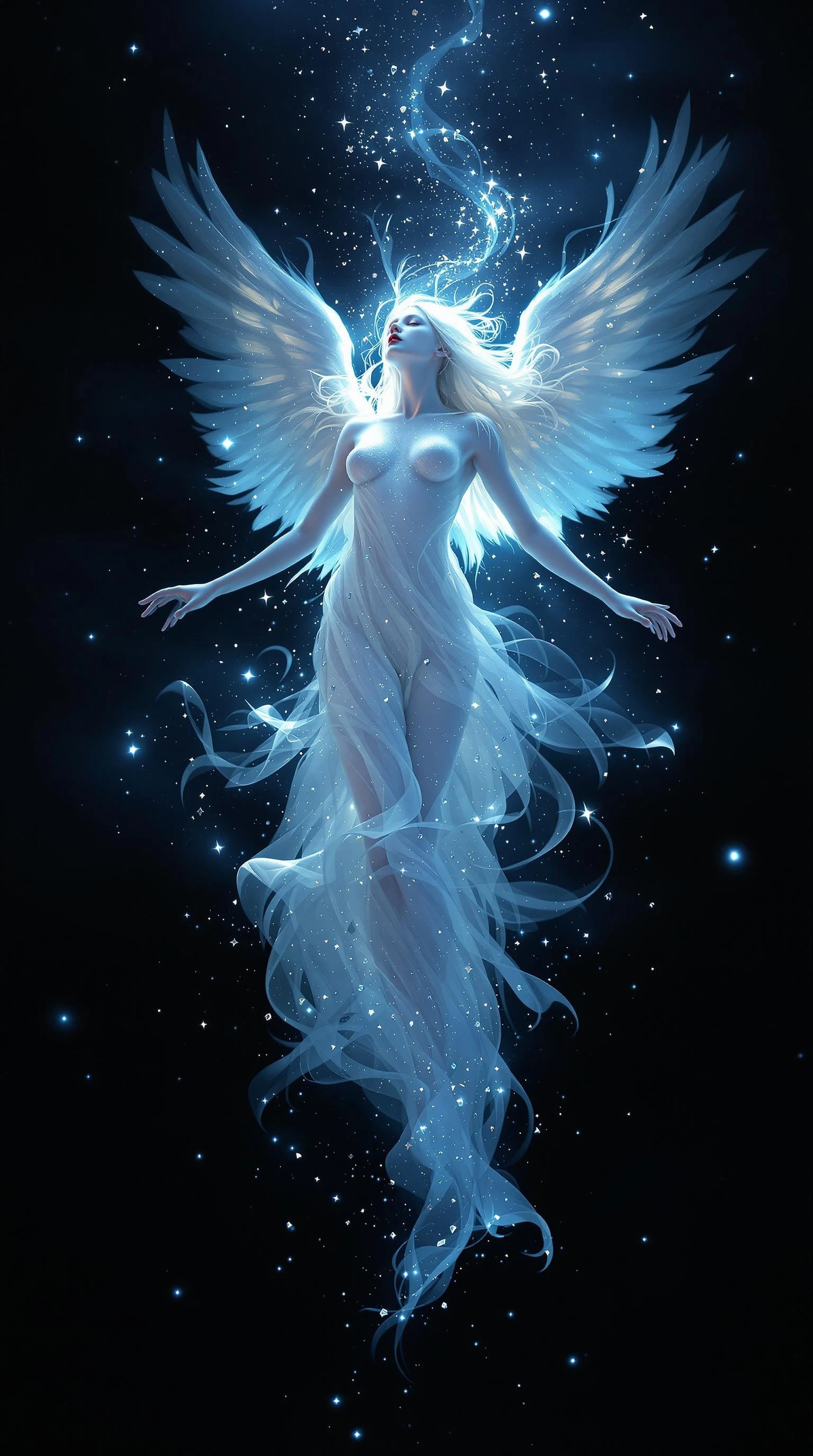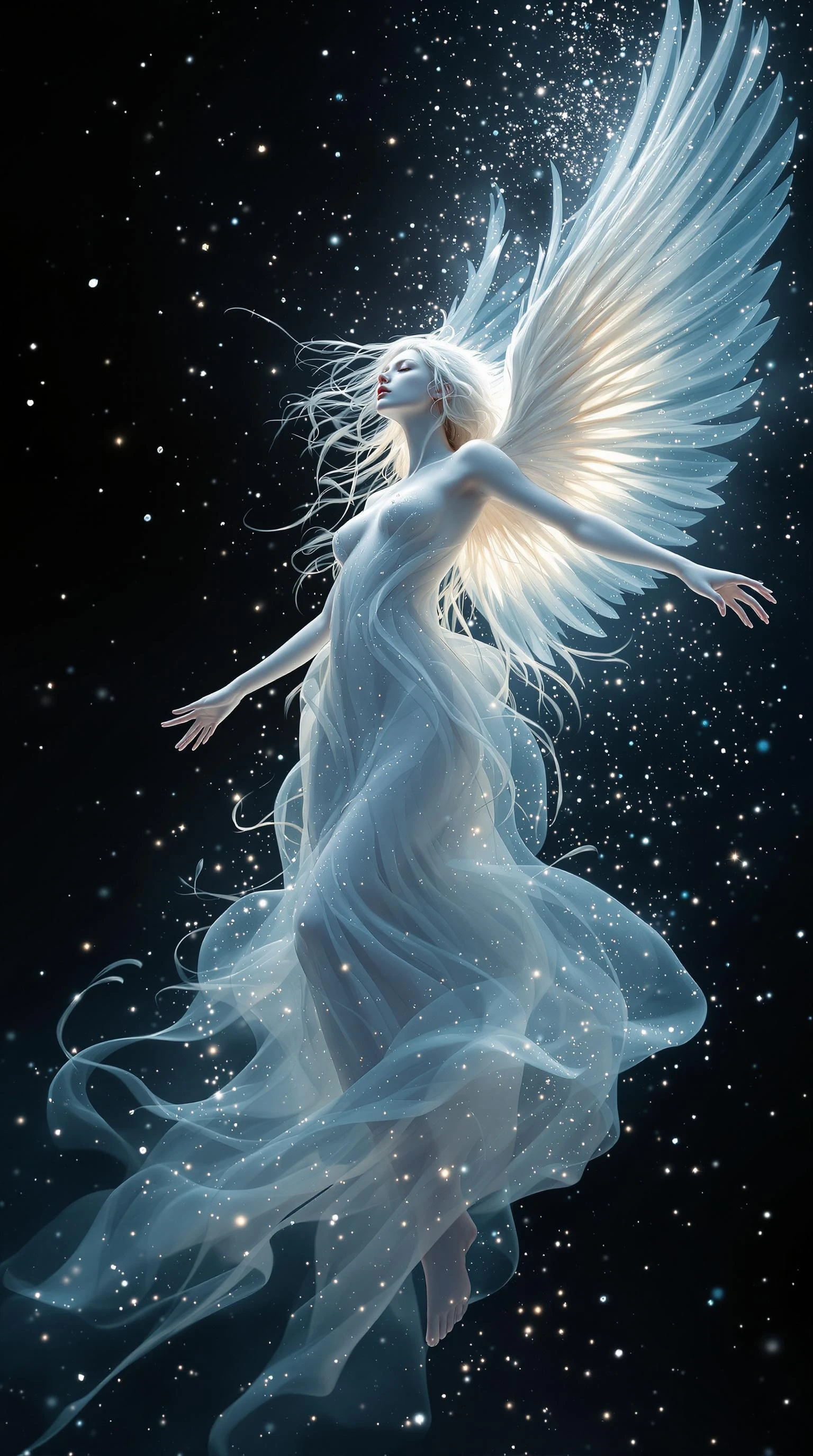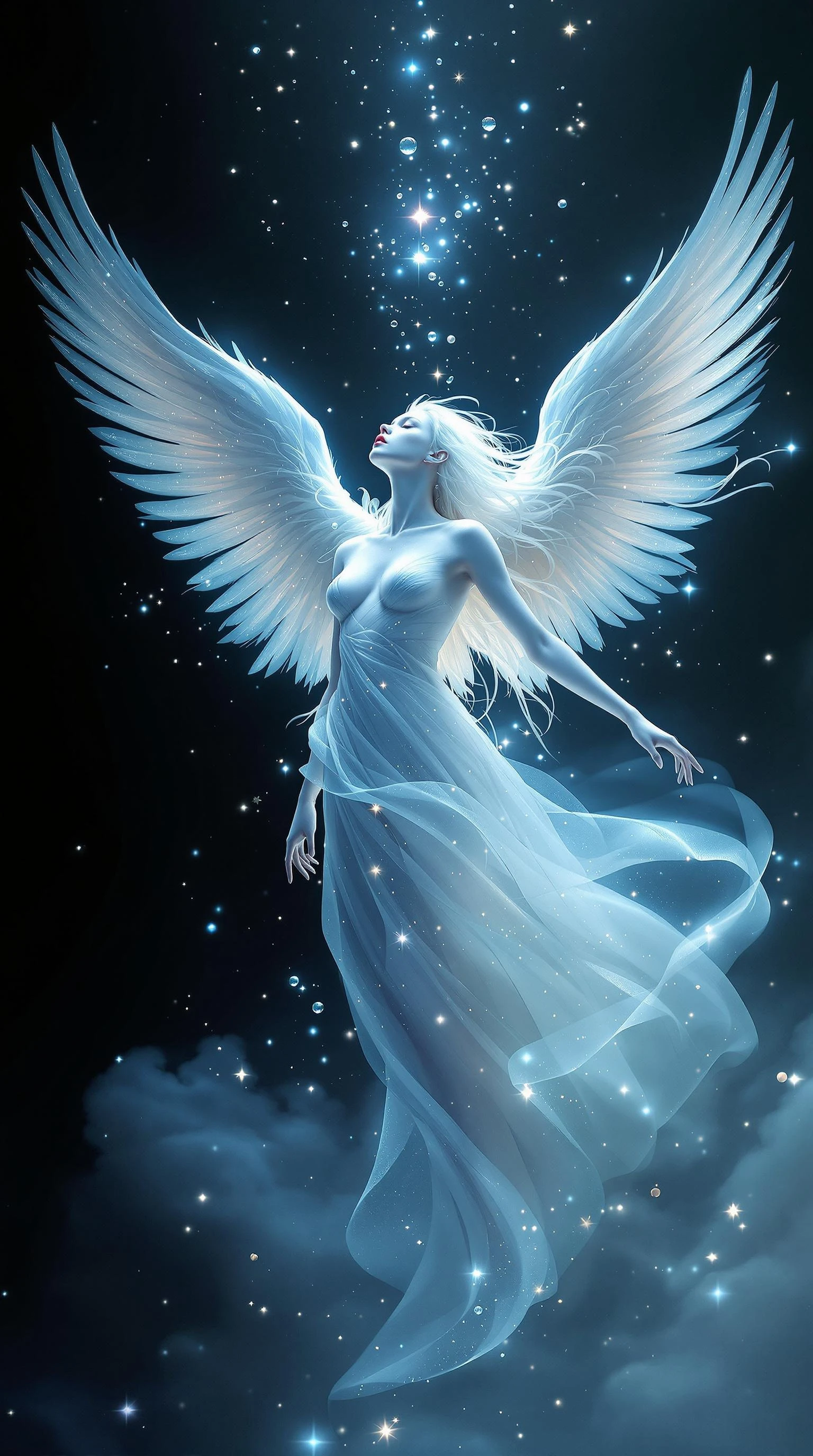 Ethereal albino angel with delicate, porcelain-like skin and hair that flows like the aurora borealis, rising heavenward with gentle, feathery wings outstretched, against a deep, mysterious background that gradates from indigo to midnight blue, with silver light particles dancing around her like fireflies on a summer evening. Conceptual art inspired by the styles of Simon Stalenhag, Ian McQue, and Ash Thorp, blending traditional and digital media with a mix of 3D fractals and organic, fluid shapes. Water droplets glisten on her skin like tiny diamonds, refracting the shimmering light that emanates from within, casting an otherworldly glow on the surrounding darkness. The atmosphere is dreamy and surreal, with a sense of weightlessness, as if the angel is floating on a cloud of alcohol ink, her form blurring softly into the black background. Every detail is meticulously rendered in high-definition, with a cinematic quality that invites the viewer to step into the scene.