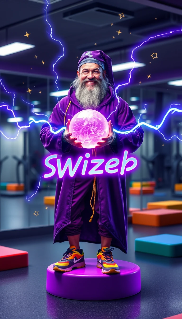 A charismatic and athletic wizard in a modern gym, wearing a stylized purple athletic robe and colorful sneakers, stands on a neon purple step. In his hands, a glowing crystal ball emitting blue-violet electric rays that snake through the air. The wizard has a well-groomed gray beard, a sports bandana on his forehead and an infectious smile. In the background, gym mirrors and other colorful steps. The lighting is dramatic, mixing gym lights with the mystical glow of the crystal ball. In the air, small stars and magical symbols float along with the rays. The text 'Step Wizard' appears in energetic letters with a purple and blue neon effect, as if they were made of magical energy. The environment combines the mystical with fitness in a fun and dynamic way. Style: digital art with elements of neon and magic."