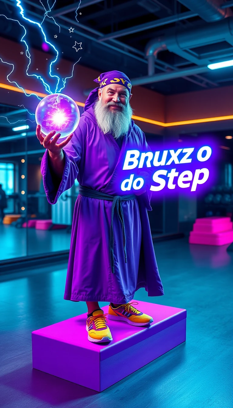 A charismatic and athletic wizard in a modern gym, wearing a stylized purple athletic robe and colorful sneakers, stands on a neon purple step. In his hands, a glowing crystal ball emitting blue-violet electric rays that snake through the air. The wizard has a well-groomed gray beard, a sports bandana on his forehead and an infectious smile. In the background, gym mirrors and other colorful steps. The lighting is dramatic, mixing gym lights with the mystical glow of the crystal ball. In the air, small stars and magical symbols float along with the rays. The text 'Bruxo do Step ' appears in energetic letters with a purple and blue neon effect, as if they were made of magical energy. The environment combines the mystical with fitness in a fun and dynamic way. Style: digital art with elements of neon and magic."