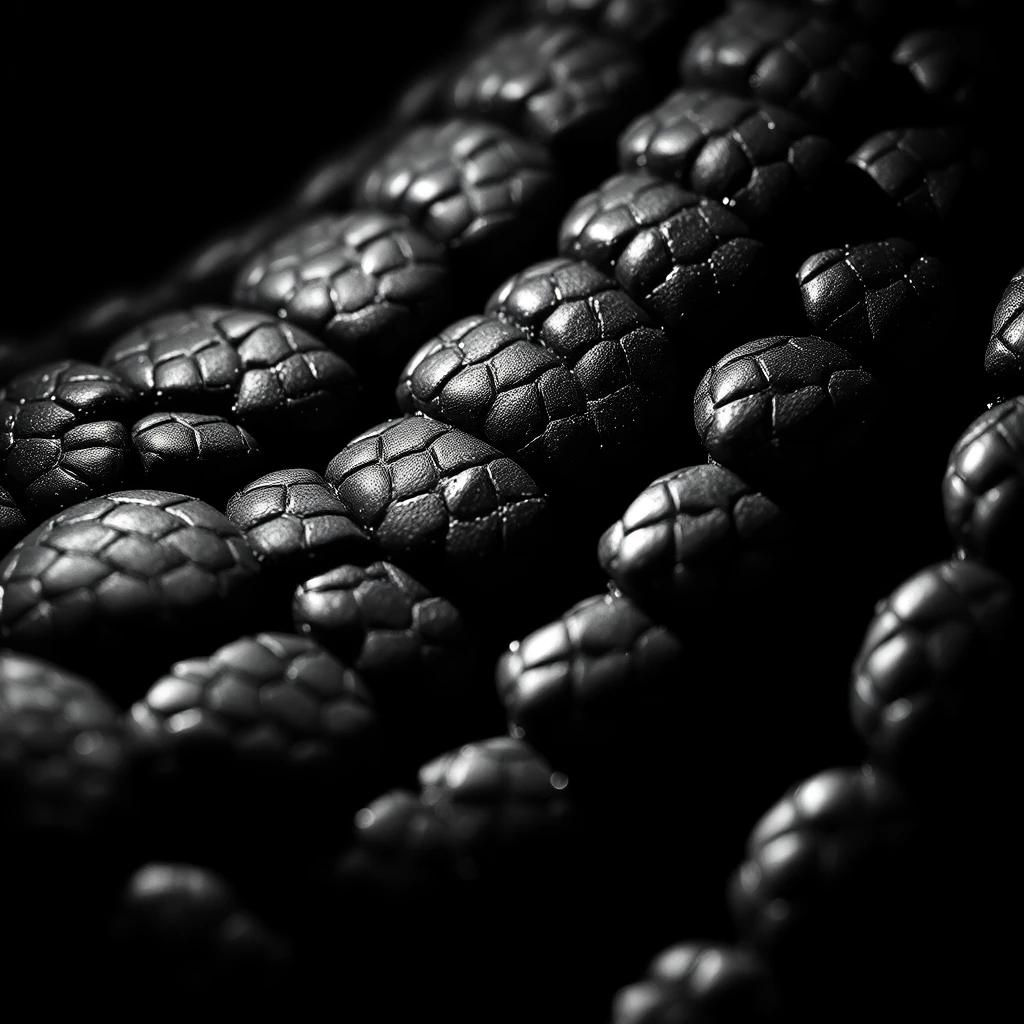 "Ultra-realistic black and white macro photography of snake scales in extreme close-up. The scales should be intricately textured and detailed, with perfectly defined natural geometric patterns. Dramatic side lighting creates a deep play of light and shadow, where each scale captures and reflects the light in a unique way, creating a mesmerizing three-dimensional effect. The microscopic details of the scales are visible, showing the natural micro-textures and irregularities. Some areas are fully illuminated, revealing the satiny texture of the scales, while others are plunged into deep shadow, creating a dramatic contrast. The composition should emphasize the natural lines and patterns of the scales, which intertwine like an organic mosaic. The focus is so sharp that you can see the tiny overlaps between the scales. Style: High-resolution black and white photography Contrast: High, with deep blacks and bright whites Texture: Ultra-detailed, almost tangible Lighting: Dramatic side lighting with smooth gradation between light and shadow Mood: Abstract and contemplative"