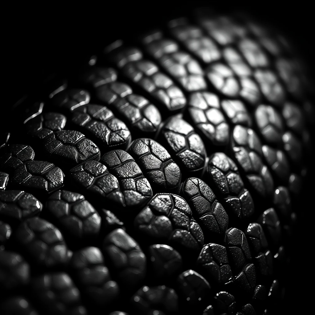 "Ultra-realistic black and white macro photography of snake scales in extreme close-up. The scales should be intricately textured and detailed, with perfectly defined natural geometric patterns. Dramatic side lighting creates a deep play of light and shadow, where each scale captures and reflects the light in a unique way, creating a mesmerizing three-dimensional effect. The microscopic details of the scales are visible, showing the natural micro-textures and irregularities. Some areas are fully illuminated, revealing the satiny texture of the scales, while others are plunged into deep shadow, creating a dramatic contrast. The composition should emphasize the natural lines and patterns of the scales, which intertwine like an organic mosaic. The focus is so sharp that you can see the tiny overlaps between the scales. Style: High-resolution black and white photography Contrast: High, with deep blacks and bright whites Texture: Ultra-detailed, almost tangible Lighting: Dramatic side lighting with smooth gradation between light and shadow Mood: Abstract and contemplative"