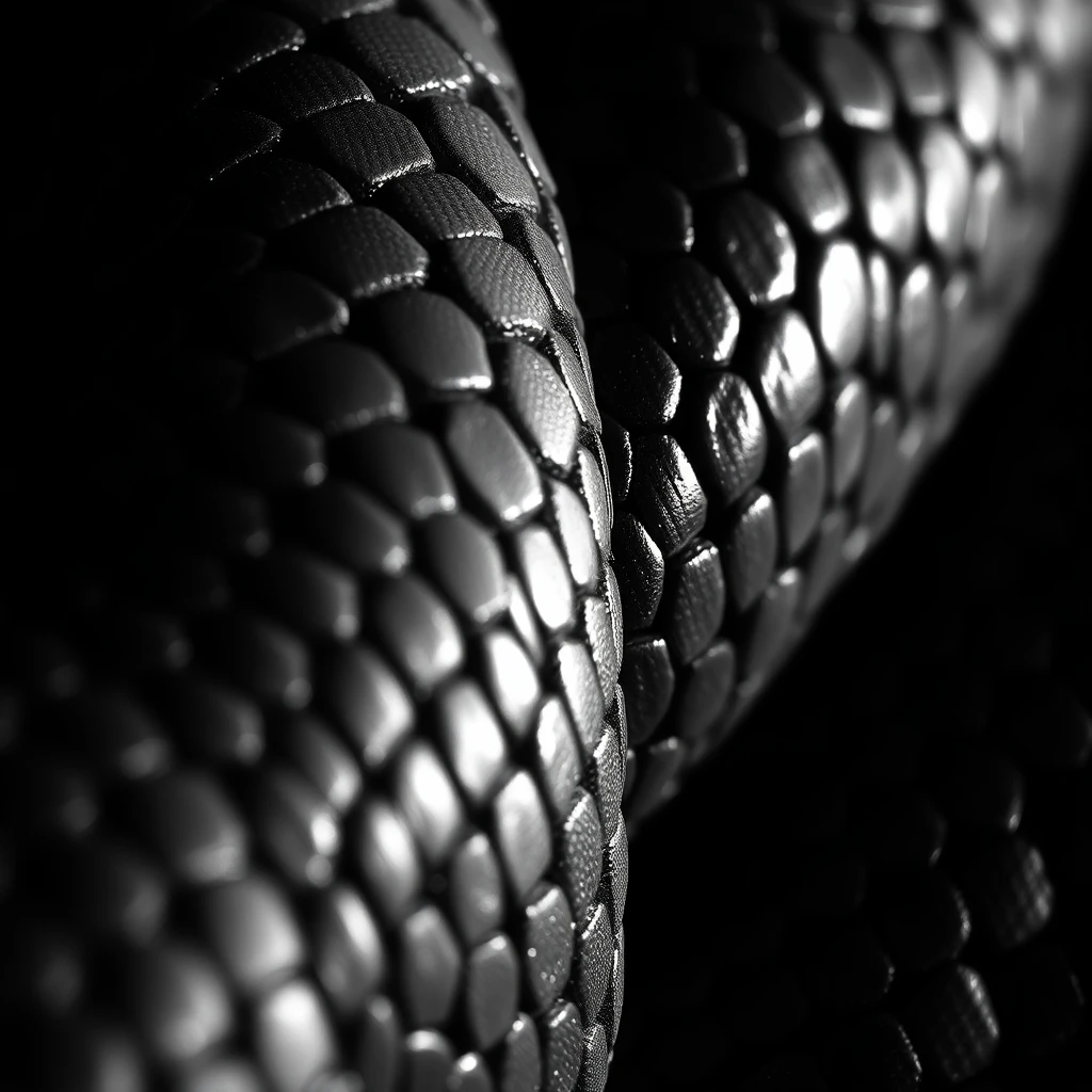 "Ultra-realistic black and white macro photography of snake scales in extreme close-up. The scales should be intricately textured and detailed, with perfectly defined natural geometric patterns. Dramatic side lighting creates a deep play of light and shadow, where each scale captures and reflects the light in a unique way, creating a mesmerizing three-dimensional effect. The microscopic details of the scales are visible, showing the natural micro-textures and irregularities. Some areas are fully illuminated, revealing the satiny texture of the scales, while others are plunged into deep shadow, creating a dramatic contrast. The composition should emphasize the natural lines and patterns of the scales, which intertwine like an organic mosaic. The focus is so sharp that you can see the tiny overlaps between the scales. Style: High-resolution black and white photography Contrast: High, with deep blacks and bright whites Texture: Ultra-detailed, almost tangible Lighting: Dramatic side lighting with smooth gradation between light and shadow Mood: Abstract and contemplative"