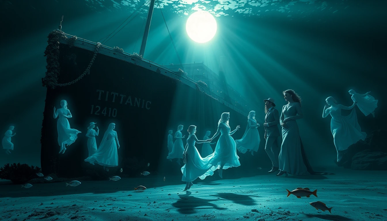 "Hyper-realistic underwater photography of the Titanic decaying on the dark ocean floor. The ship's bow rests majestically covered in coral and rust, while beams of moonlight penetrate the water, creating ethereal rays that partially illuminate the scene. Translucent, ethereal figures of passengers in 1912 period costume - women in long dresses and hats, men in tuxedos - float silently around the ship like ghosts. Their expressions are one of deep melancholy, some seem to be eternally dancing one last waltz, others embracing their loved ones. Small personal objects are scattered across the sand on the seabed - a porcelain doll, a pocket watch stopped at 2:20, children's shoes, a violin. Schools of deep-sea fish swim lazily among the spectral figures. The color palette is predominantly deep blues and ocean greens, with touches of turquoise where the moonlight touches the water. The ghosts emit a soft blue-white glow. The textures are ultra-detailed—you can see the rust on the metal, the ripples of seaweed, the particles suspended in the water dancing in the light. Occasional bubbles rise slowly, creating a sense of silent movement. Style: Digital photorealism with supernatural elements Mood: Melancholic, haunted, reverent Lighting: Dramatic, underwater, with moonlight beams Composition: Wide-angle view showing both ship and spirits"