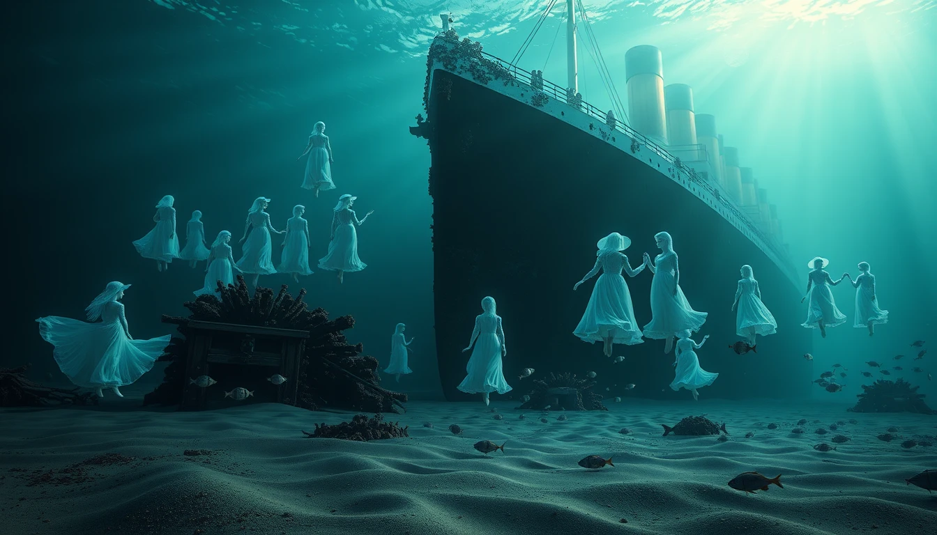 "Hyper-realistic underwater photography of the Titanic decaying on the dark ocean floor. The ship's bow rests majestically covered in coral and rust, while beams of moonlight penetrate the water, creating ethereal rays that partially illuminate the scene. Translucent, ethereal figures of passengers in 1912 period costume - women in long dresses and hats, men in tuxedos - float silently around the ship like ghosts. Their expressions are one of deep melancholy, some seem to be eternally dancing one last waltz, others embracing their loved ones. Small personal objects are scattered across the sand on the seabed - a porcelain doll, a pocket watch stopped at 2:20, children's shoes, a violin. Schools of deep-sea fish swim lazily among the spectral figures. The color palette is predominantly deep blues and ocean greens, with touches of turquoise where the moonlight touches the water. The ghosts emit a soft blue-white glow. The textures are ultra-detailed—you can see the rust on the metal, the ripples of seaweed, the particles suspended in the water dancing in the light. Occasional bubbles rise slowly, creating a sense of silent movement. Style: Digital photorealism with supernatural elements Mood: Melancholic, haunted, reverent Lighting: Dramatic, underwater, with moonlight beams Composition: Wide-angle view showing both ship and spirits"
