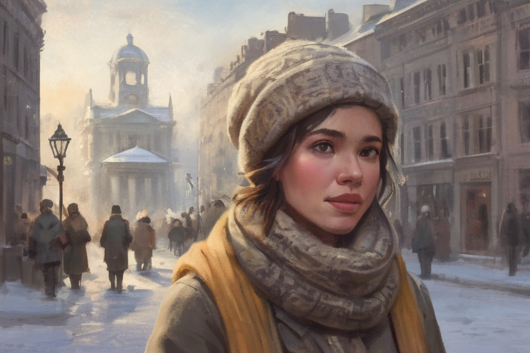 (masterpiece, best quality:1.2), Incredibly detailed close-up of a girl wearing a puffer jacket and a knit hat, with her hand on her scarf. She stands on a snowy city street corner in winter, surrounded by softly falling snow. Her warm clothing includes a thick coat and a scarf, adding to the cozy winter atmosphere. The background features urban details like buildings and streetlights, slightly blurred to emphasize her expression and attire. vic3 <lora:vic3XL_v4-000006:0.9>