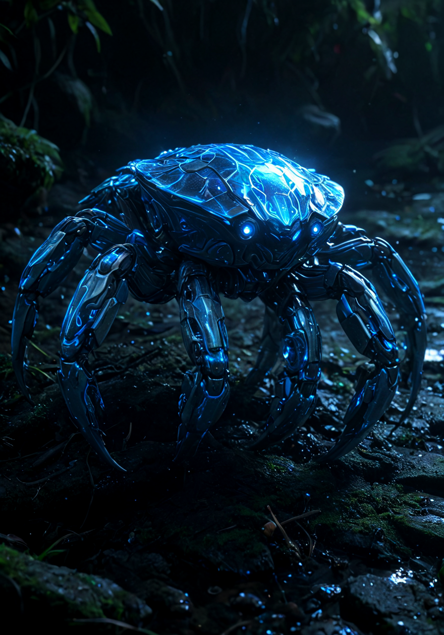 (HD, masterpiece, best quality, hyper detailed, ultra detailed, super realistic),elegant crab, best quality, mechanical animal, highly detailed, sharp focus, dynamic lighting, robot utopia, blue glow lines, robotic replication of nature itself, dynamic scene, action scene, (in style of Peter Elson), SilverPulse, midjourneyv6.1, SilverPulse<lora:aidmaMidjourneyV6.1-v0.1.safetensors:0.26:0.26> <lora:SilverPulseMorphXL.safetensors:0.6:0.6> <lora:aidma-Image Upgrader-v0.1.safetensors:0.4:0.4>
