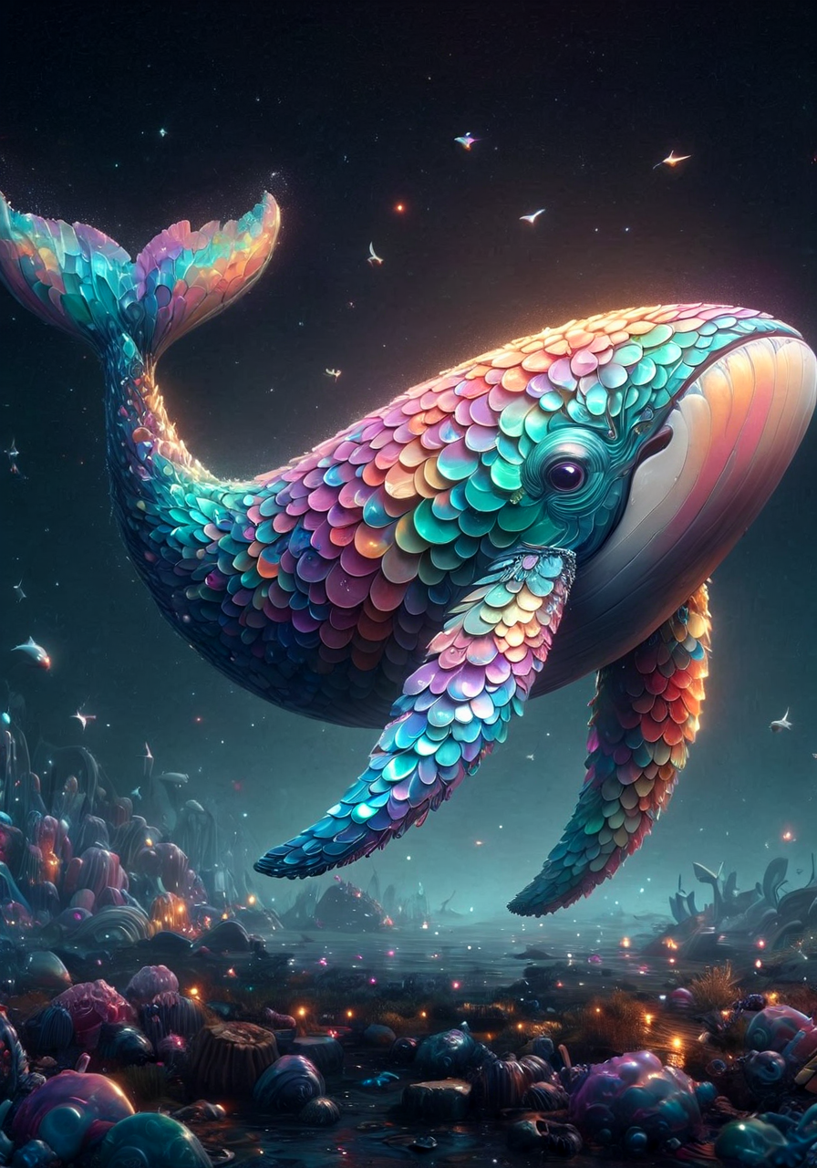 An image of an whale. Animal. It should be a cartoon in a 3D style. The lighting should be neon, and the colors should be vibrant. In a photo studio. running, midjourneyv6.1, p1nk1r1sc4l3s, made out of iridescent scales<lora:aidmaMidjourneyV6.1-v0.1.safetensors:0.26:0.26> <lora:PinkieIriSclsSDXL-v1.safetensors:1.0:1.0> <lora:aidma-Image Upgrader-v0.1.safetensors:0.4:0.4> <lora:Fantasy with epic details - XL SDXL v1.0.safetensors:0.4:0.4>