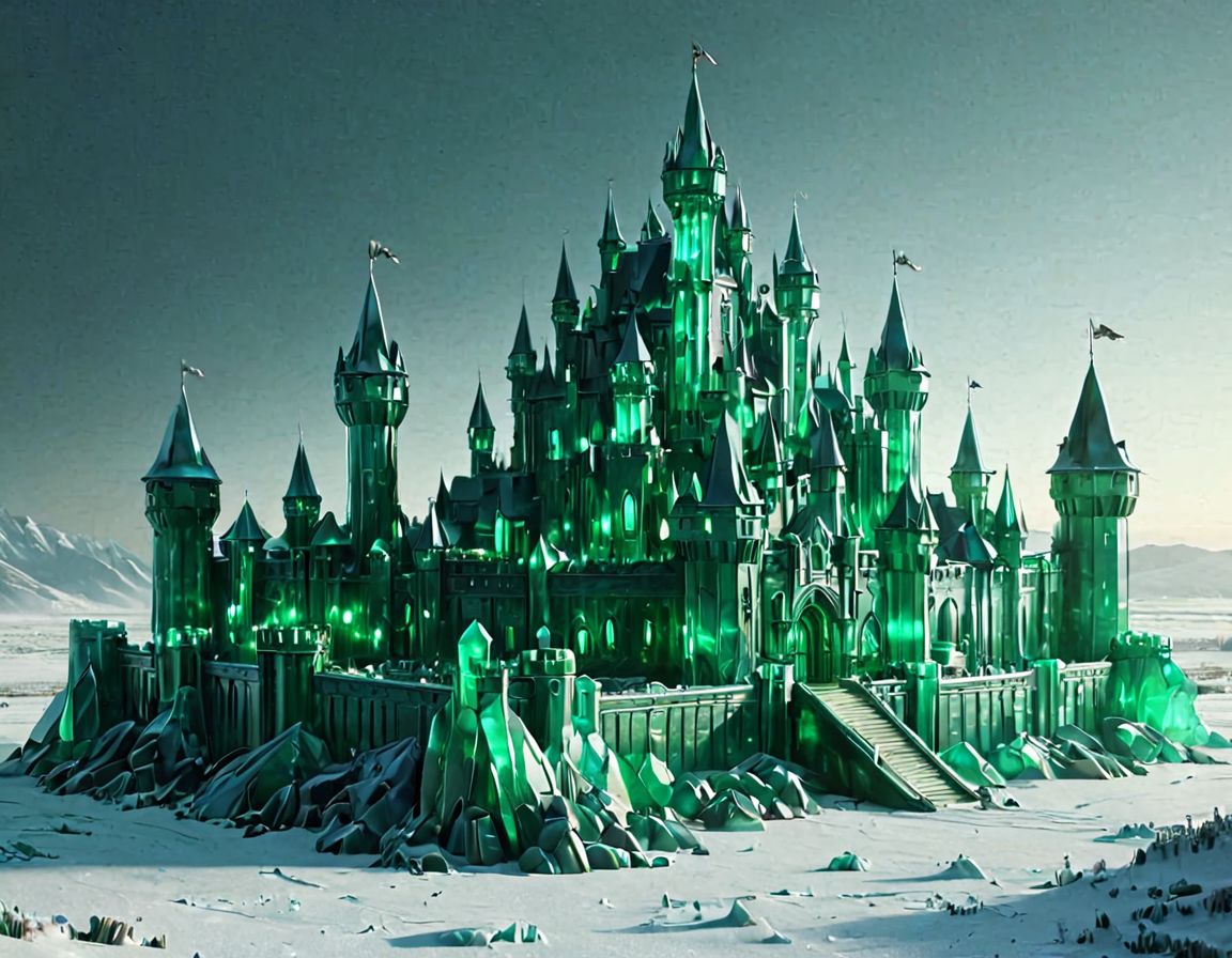 emeraldmorph, a fairy tale castle floating over a frozen plain, glowing green <lora:EmeraldMorph:1>