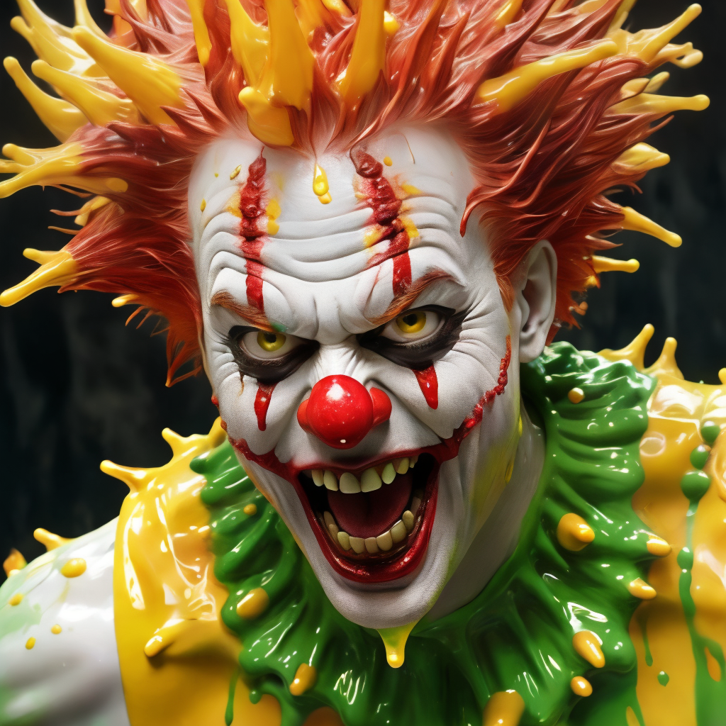 heroic fantasy painting of A feral clown in full makeup made of slime, his spiky red hair is on fire, comical panic, reaching towards viewer, slime-morph, sl1m3d, translucent slime, transparent slime, jello-like slime, jelly slime, liquid slime, red slime, yellow slime, green slime, fine details, sharp, highly detailed, in the dangerous fantasy world. airbrush over oil on canvas. best quality, high resolution