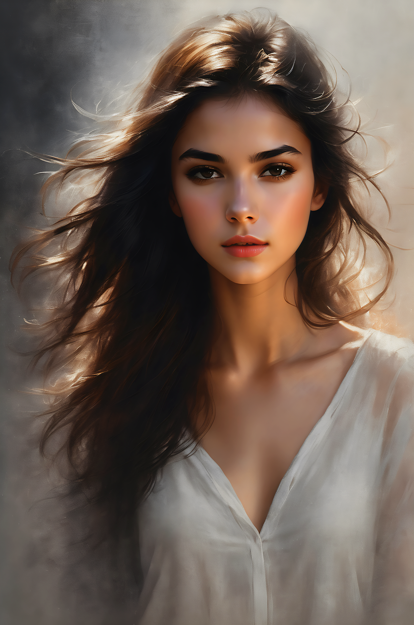 young woman, pretty and youthful face, perfect body, dynamic pose, photo of twbabexl01, character portrait, low-key, oil and watercolor painting, textured hair style, dark brown hairs, absurdres, masterpiece, 8k, high detail, intricate, best quality, photorealistic, hyperrealistic art, extremely high-resolution details, photographic, realism pushed to extreme, fine texture, incredibly lifelike, <lora:twbabexl01:0.2>, <lora:desolation:0.3>