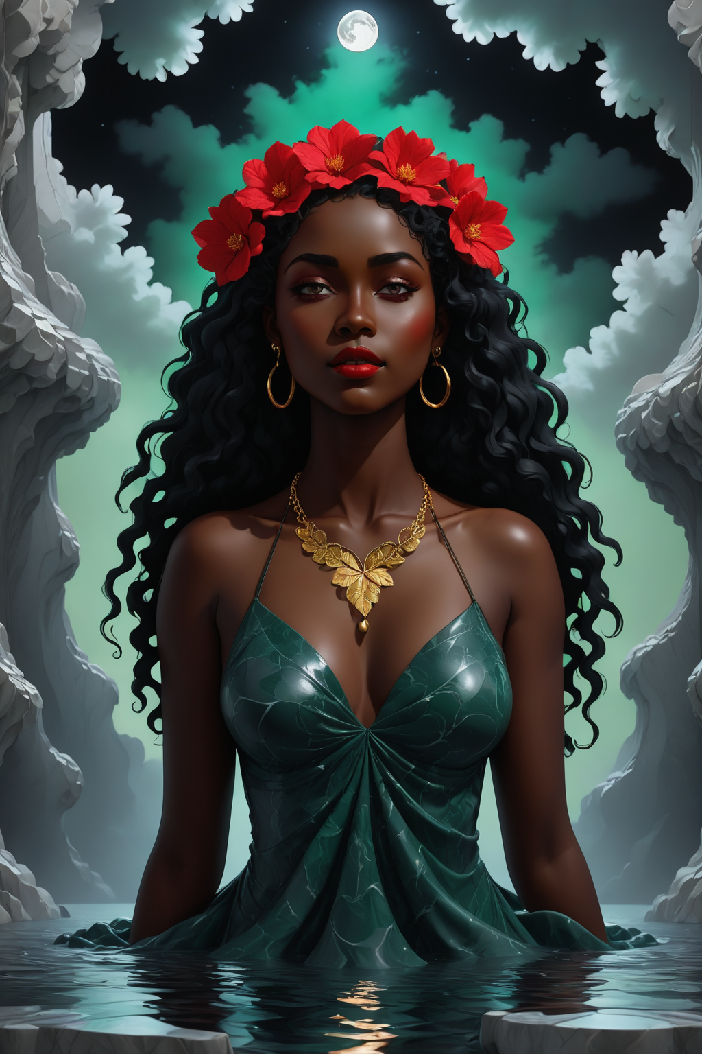 <lora:GeekyXL_Liquid_Marble:1>, Liquid Marble, 1girl, jewelry, solo, green eyes, necklace, breasts, dark-skinned female, earrings, dark skin, night, moon, hoop earrings, flower, looking at viewer, long hair, full moon, upper body, sky, heart, night sky, red hair, gold necklace, outdoors, heart necklace, wavy hair, lips, dress, makeup, curly hair, leaf, red flower, eyelashes