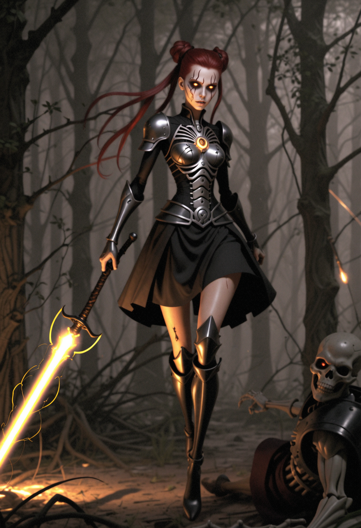 2D concept art full-body image portraying slender female inquisitor slashing attack. She has auburn updo hair and crimson goth makeup, dressed in charged powered exo-skeleton with exposed midriff. Set in a lush meadow environment where a biomechanical experiment is conducted, reflecting particles, serene atmosphere. With hard three point lighting, epic, perfect composition, grimdark beauty, vibrant <lora:dmd2_sdxl_4step_lora>