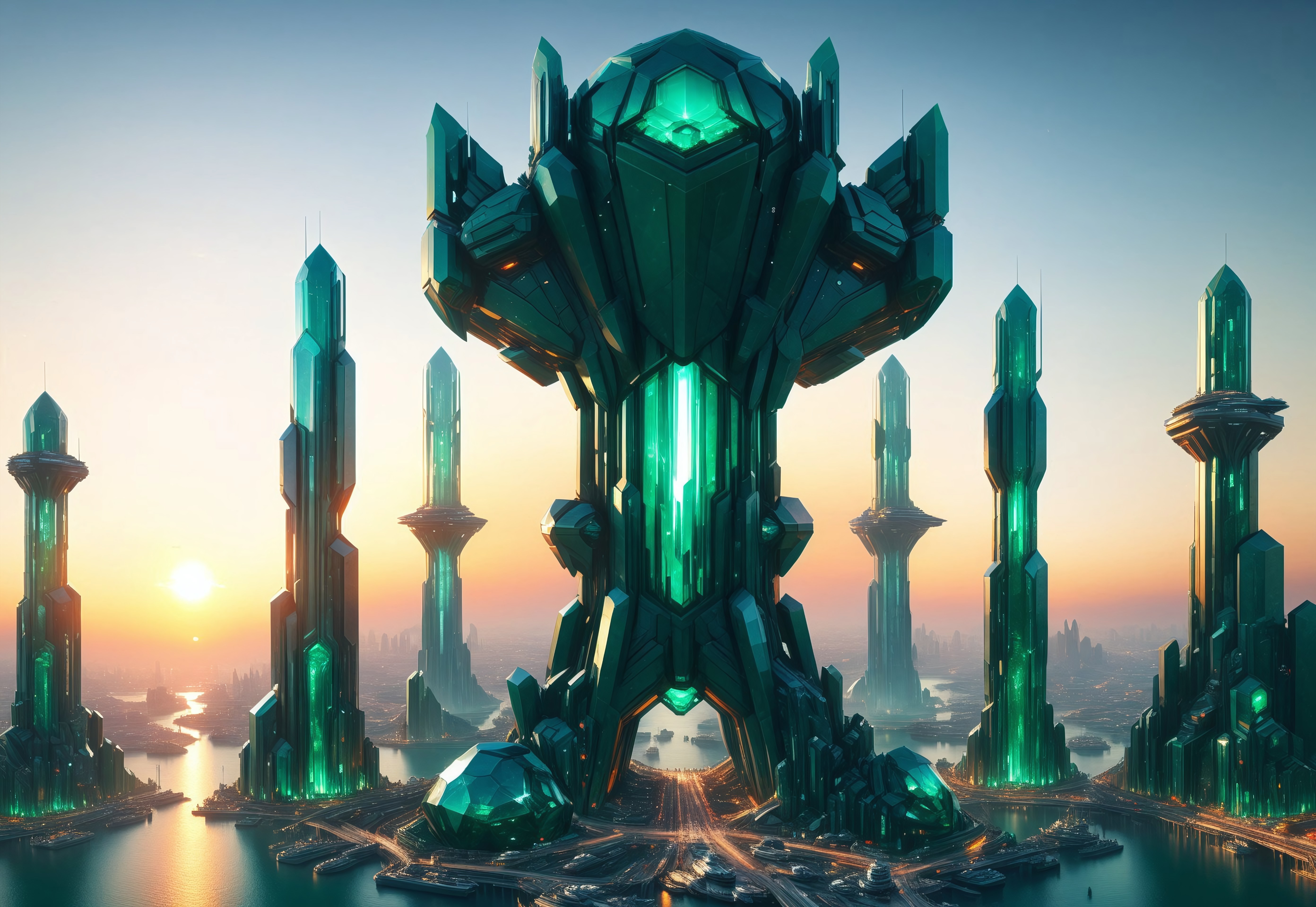 exploring a gigantic starship, f8.0, sunset, perfect focus, colorful hexagonal megastructure pillar world, high detail, future cityscape emeraldmorph