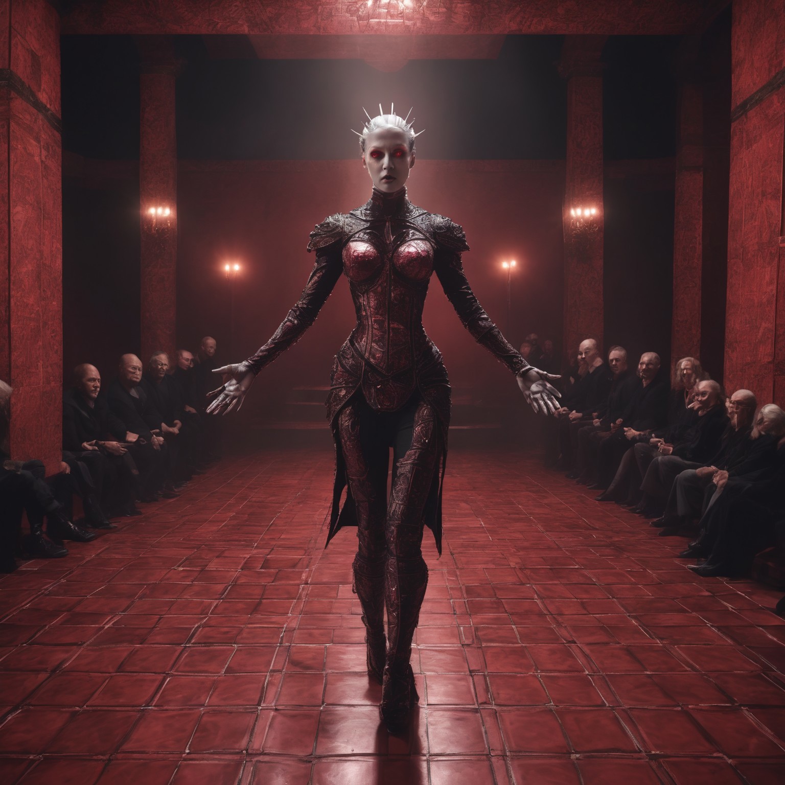safe_pos, Close up of Sexy Female ((pinhead)) hellraiser walking on red tiles. Arms outstretched. Gothic image. Tiled raised stage. Other People sitting on either side of stage. Cool lighting.