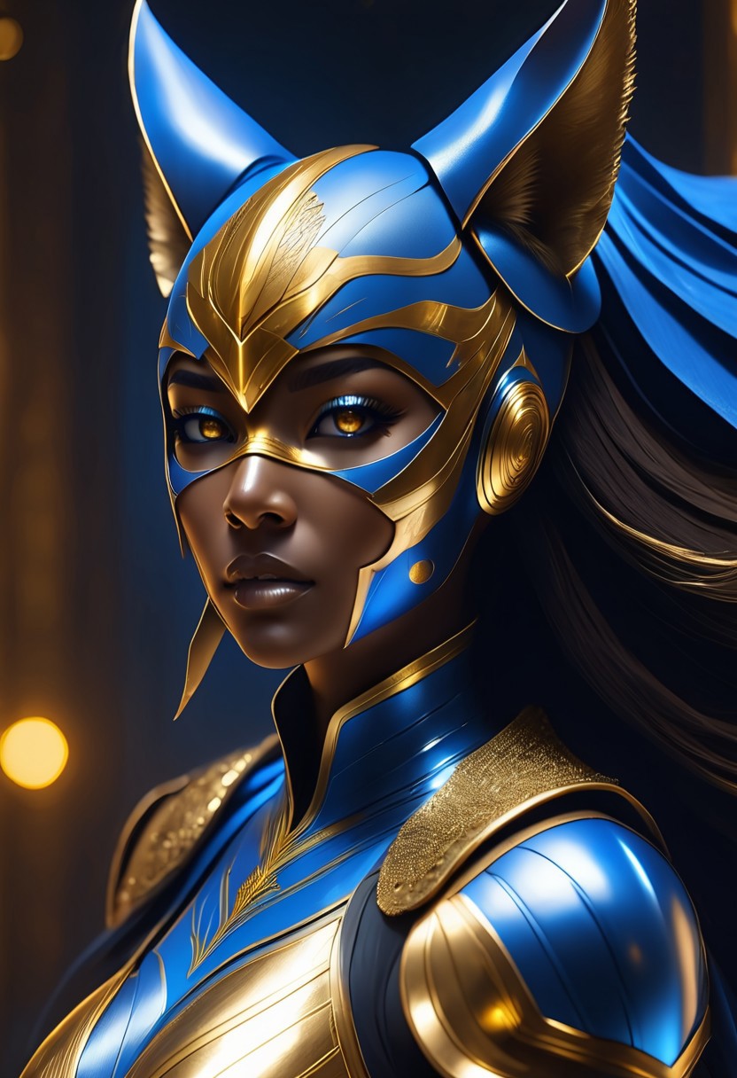The image is a digital illustration of a female warrior wearing a futuristic helmet with a unique design. The helmet is made of metal and has a golden and black color scheme with intricate details on the front and back. The face of the helmet is covered with a blue and gold mask that covers the entire face. The mask has two large cat ears on either side of the eyes and a pointed nose. The woman's hair is styled in a high ponytail and she is wearing a blue cape with gold accents. She is also wearing a gold and silver armor with a large chest plate. The background is dark and blurred with a hint of orange and yellow lights shining down on her. The overall mood of the image is intense and powerful, colored skin, Hyperdetailed.