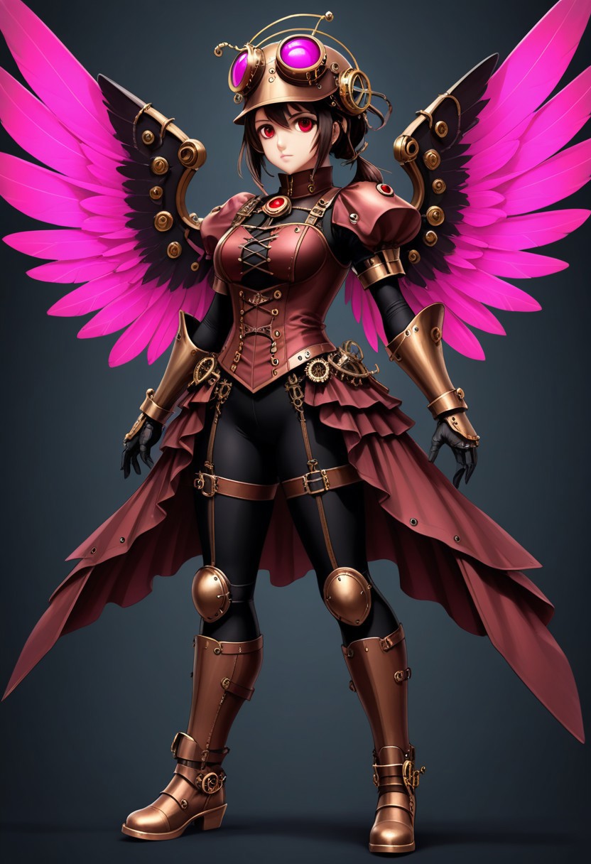 score_9_up, score_8_up, score_7_up, pink matrix code, 1girl, ladybug girl, a bit chubby, short stature,, body tight steampunk armor, ((coat, helmet)), wings, figting stance, vivid colors, codeandigital, cyberw0rlds, c0dean0igital,