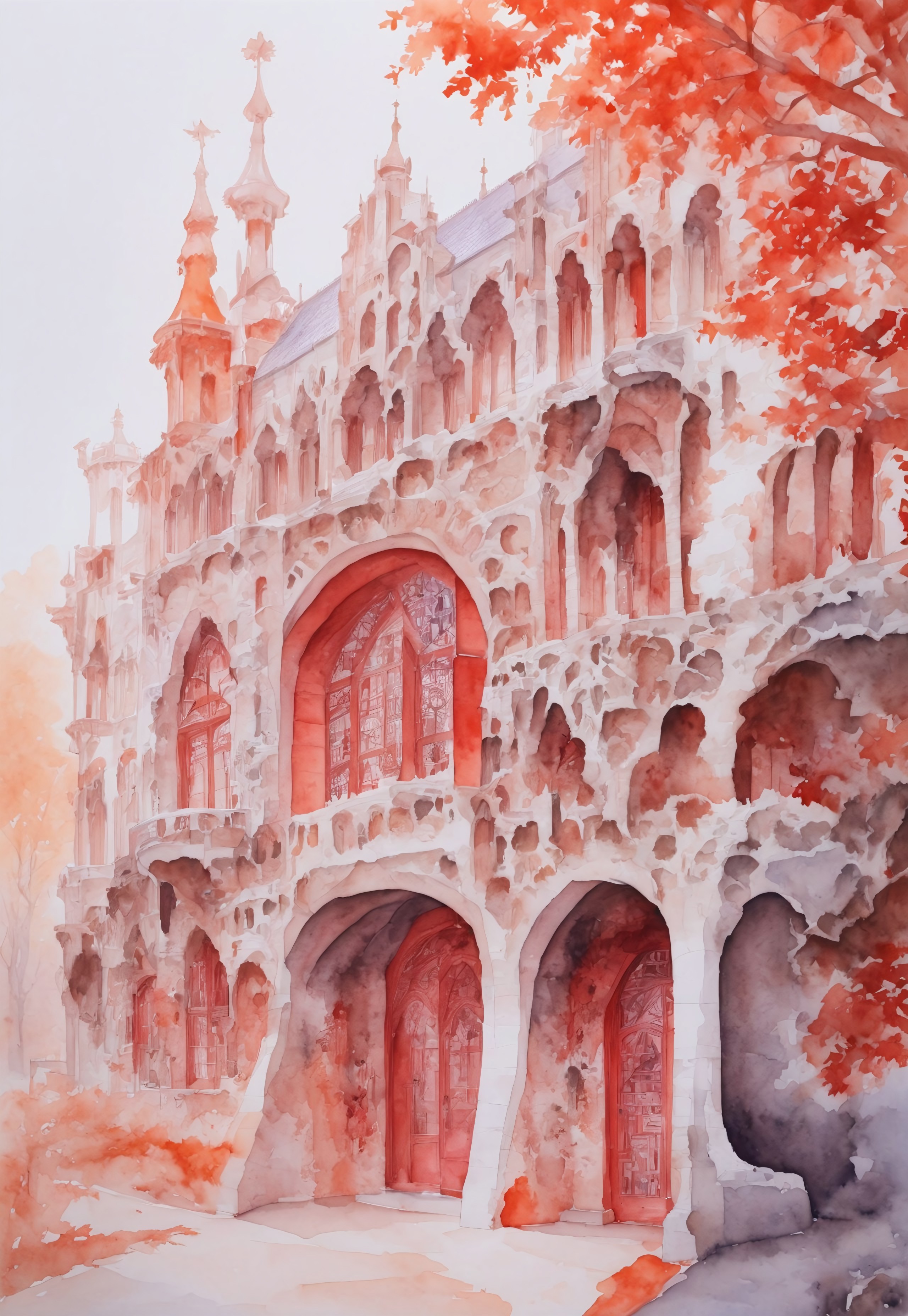 The gorgeous watercolor paintings designed by Gaudi Archi show a palace-level design sense and are pleasing to the eye. The design color is mainly white red color orange like Landscape in fall. white red orange