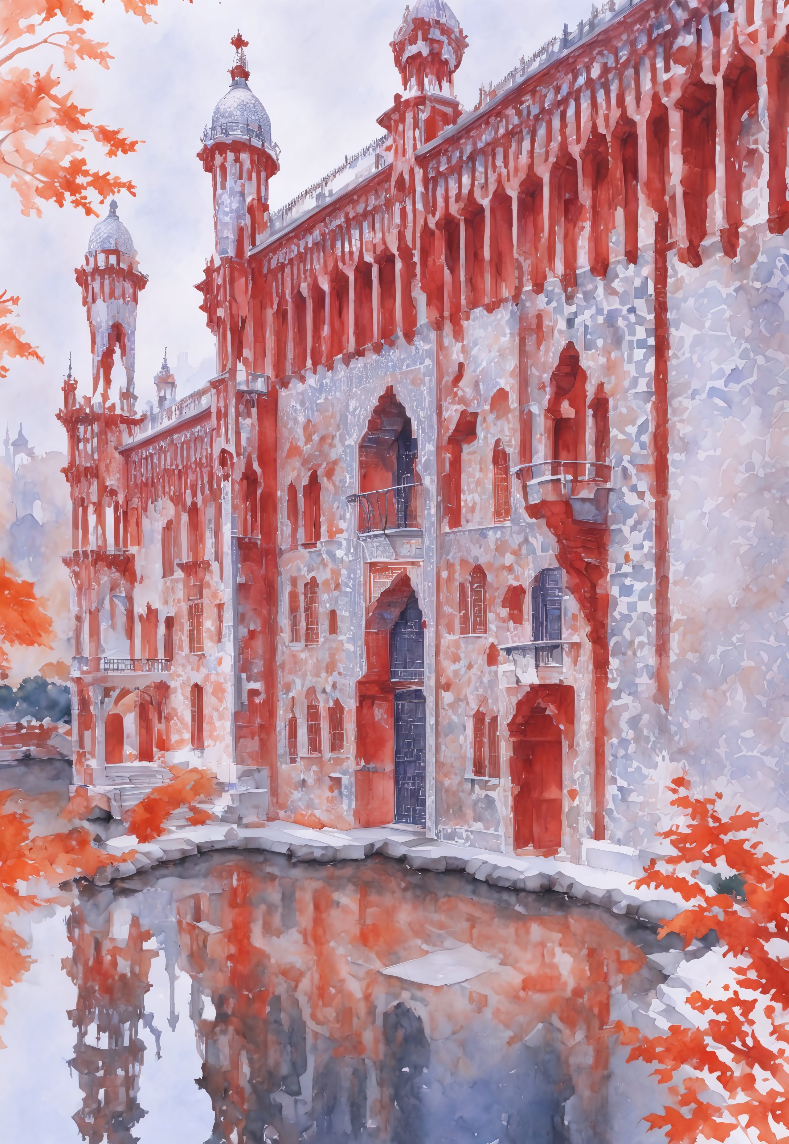 The gorgeous watercolor paintings designed by Gaudi Archi show a palace-level design sense and are pleasing to the eye. The design color is mainly white red color orange like Landscape in fall. white red orange